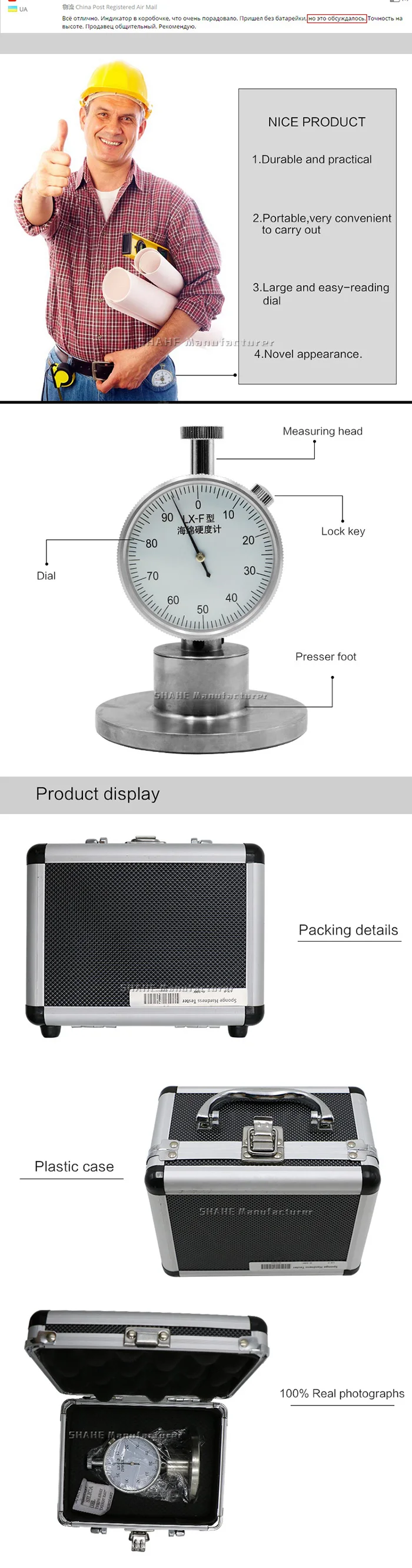 Характеристика: LX-F тестер твердости губки подходит для проверки твердости мягкой пены, полиуретановой пены резины. И он будет отличаться от другого твердого теста в аспектах использования. При использовании прижимная стопа напрямую контактирует с используемым образцом и расценивает собственный вес как нагрузку для измерения силы.