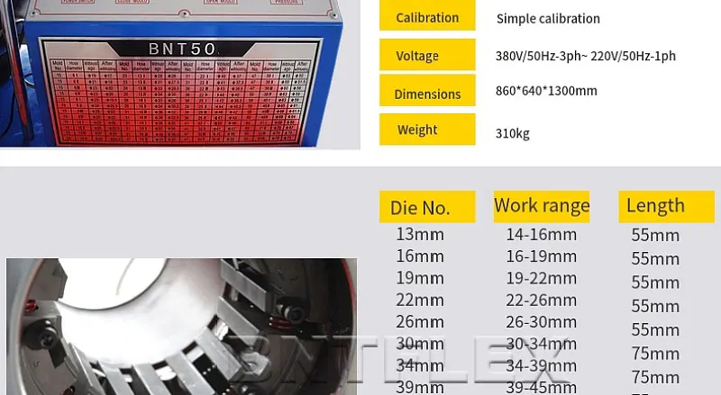 BNT50 manual hydraulic hose crimping machine for sale is suitable for high precision pressing of low and high pressure hose diameter ,starting from 1/4" to 2" internal hose pipe.