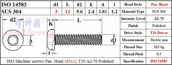 ISO 14583 M3x12 головка T10 драйвер SUS 304