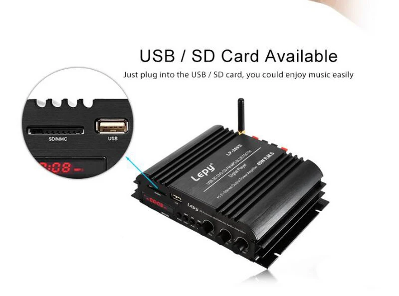 Не нужно покупать диск, если ваши любимые музыкальные файлы MP3 загружаются на телефон, u-диск, sd-карту, усилитель может читать музыкальные файлы MP3 напрямую. И светодиодный дисплей с яркой подсветкой может показать статус воспроизведения, легко управлять музыкой в режиме реального времени