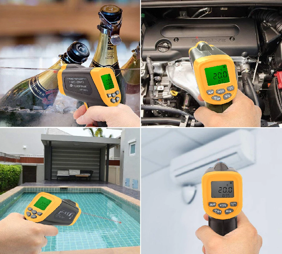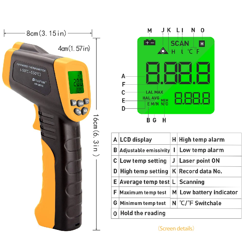 ★Более высокий стандарт ● Безопасное измерение температуры поверхности с расстояния, сохраняя при этом точность лазерного излучения. Используется высококачественная Инженерная Пластмасса ABS, контур художественный, цвет Восхитительный. ● Практичный как для использования в помещении, так и на открытом воздухе, инфракрасный термометр 981C прост в эксплуатации и прост в хранении. Используйте инфракрасный температурный сканер для широкого спектра применения, от внутренних электронных компонентов до температур печи. ★Необычные Особенности ✔Уникальный цветной экран, Кен-безграничный, четкий с первого взгляда. ✔12 заостренных винтов с диафрагмой сообщить вам, площадь поверхности должны быть проверены непосредственно и автоматически блокирует D:S 12:1 ✔Может установить верхнее или низкое предельное значение для сигналов тревоги. Найдите нормальную температуру в режиме реального времени и быстро обнаружите неисправность. ✔Излучательная способность может регулироваться с 0,10 до 1,00 ✔Может свободно переключаться по Цельсию и по Фаренгейту ✔Включить или выключить подсветку и лазер самостоятельно ★Без опасности Бесконтактное измерение экстремальных температур от-50 °C(-58 °F) до 550 °C(1022 °F). Инфракрасный термометр 981C устраняет потенциальную опасность вредных ожогов или незначительного обморожения.