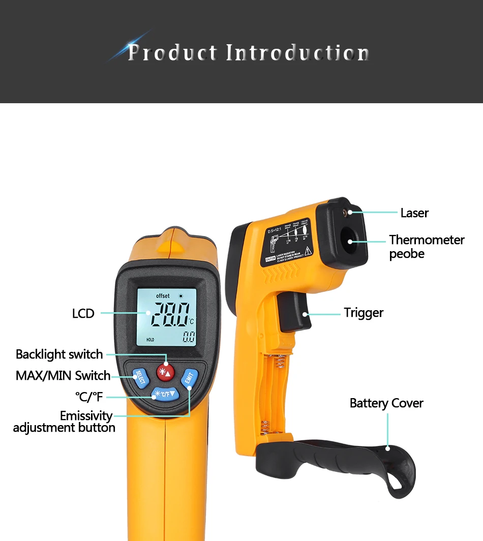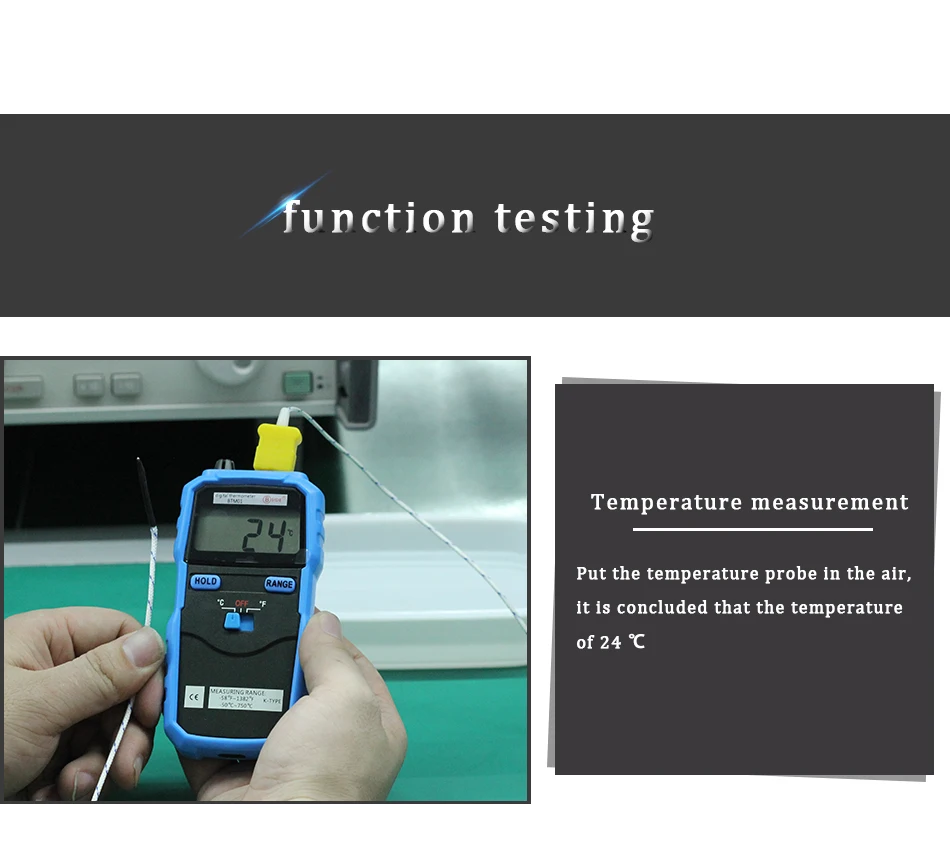 Прибор представляет собой портативный цифровой термометр. Он имеет стабильную производительность, высокую точность, низкое энергопотребление, новую структуру. Безопасный и надежный, это идеальный измерительный прибор для большинства пользователей.