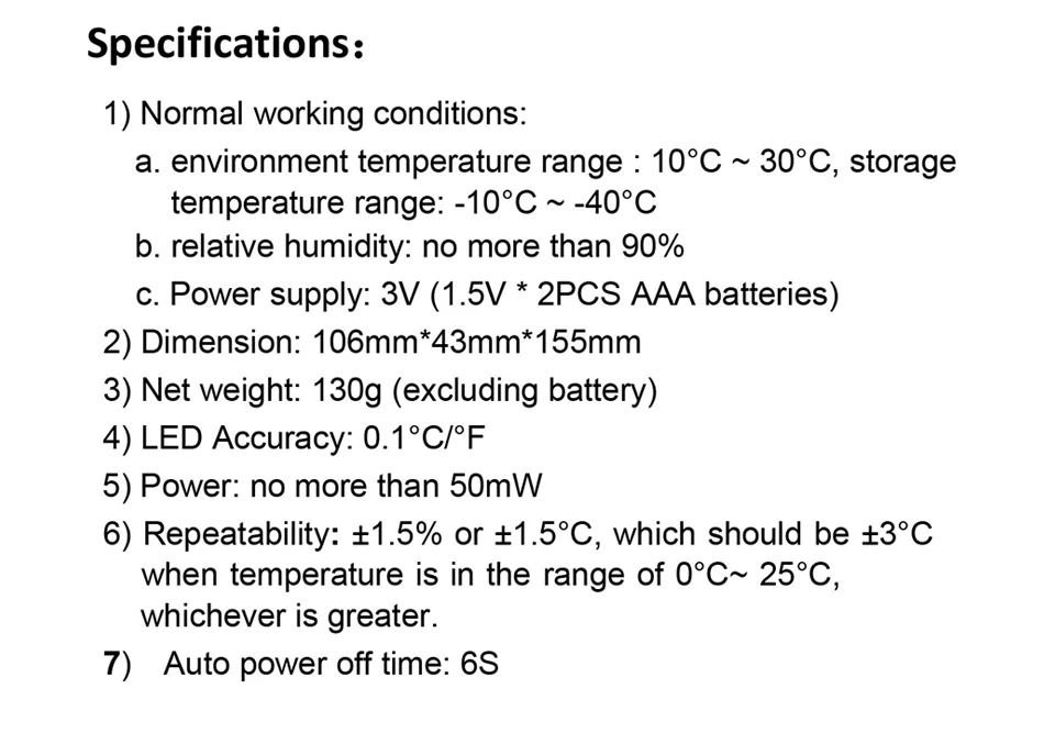 Условия использования: Рабочая среда: 0 ~ 40 °C (<80% RH). Среда хранения:-10 ~ 60 °C (<70% RH, без батарей). Частота дискретизации: около 2 раз в секунду. Дисплей: 3 1/2 бит ЖК-дисплей. Регулятор температуры с термопарным открытая индикация: При неподключении к термопаре или открытой термопаре отображается температура окружающей среды. Индикатор низкого заряда батареи: Когда напряжение батареи ниже нормального рабочего напряжения, “” будет отображаться на ЖК-дисплее. Требования к питанию: 2 батарейки AAA 1,5 в Размер: 128x61x25 мм Зонд термопары: TP-01 термопары типа K с вилкой Термоэлектрическая муфта, как правило, применяется во многих областях. Диапазон:-50 °C ~ 250 °C (-58 °F ~ 482 °F). Точность: ± (0.5% + 1 °C). Длина: 1 м, с миниатюрной вилкой. Точность Технические характеристики Точность применяется в течение одного года после калибровки. Исходное состояние: температура окружающей среды 18 °C до 28 °C, относительная влажность не более 80. Цельсия: Диапазон Разрешение точность -50,0 °C ~-20,0 °C 0,1 °C ±6°c -20,0 ° C ~-0,0 ° C 0,1 ° C ±3° C 0,0 °C ~-200 °C 0,1 °C ± (1.0% Чтение + 2 °C) 200 °C ~-500 °C 1 °C ± (1.0% Чтение + 2 °C) 500 °C ~-750 °C 1 °C ± (1.0% Чтение + 3 °C) Фаренгейта: Диапазон Разрешение точность -58,0 ° F ~-4,0 ° F 0,1 ° F ±8° F -4,0 ° F ~ 32,0 ° F 0,1 ° F ±5° F 32,0 ° F ~ 200 °F 0,1 °F ± (1.0% Чтение + 4 ° F) 200 ° F ~ 932 ° F 1 ° F ± (1.0% Чтение + 4 ° F) 932 ° F ~ 1382 ° F 1 ° F ± (1.0% Чтение + 5 ° F) Посылка включает в себя: 1 х цифровой термометр 1 x регулятор температуры с термопарным зонд Руководство пользователя (1 шт.) Сумка для хранения-1 шт.