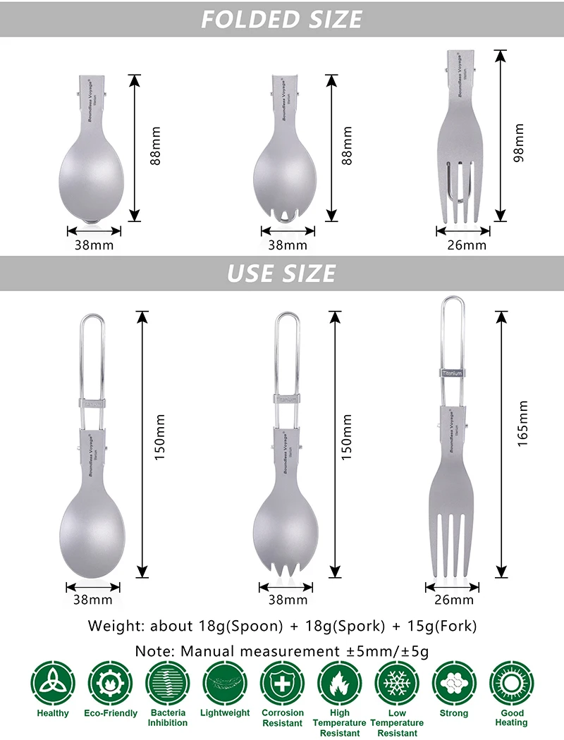 Ложка: Размер (Д) 150 x (Ш) 40 мм, Размер складывания: (Д) 80 x (Д) 38 мм; Около 18 г