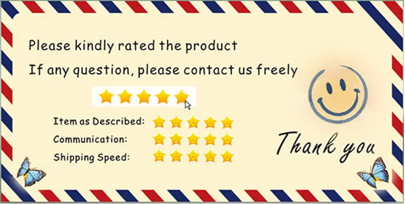 Спасибо за покупку в нашем магазине. Мы надеемся, что вы наслаждаетесь покупкой. Ваш опыт покупок очень важен для нас и нашего бизнеса. Пожалуйста, дайте нам пять звезд. Ваша пятизвездочная звезда очень важна для нас. Если вы не удовлетворены моим продуктом и обслуживанием, пожалуйста, сначала свяжитесь с нами, мы можем попытаться решить вашу проблему. Большое спасибо