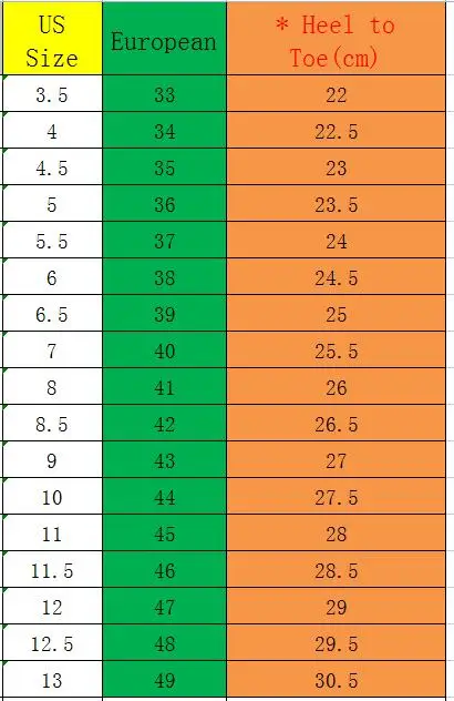Потому что у людей в разных странах разные размеры обуви, и наша компанияЕвропейский размерИДлина стопы(Отмечен на этикетке размера обуви) в качестве стандарта.Пожалуйста, убедитесь и выберите размер по длине вашей стопы!Поэтому вам нужно только точно измерить стопу, а затем свериться с таблицей размеров, чтобы выбрать правильный размер. Мы отправим европейский размер, европейский размер является нашим стандартом измерения обуви!