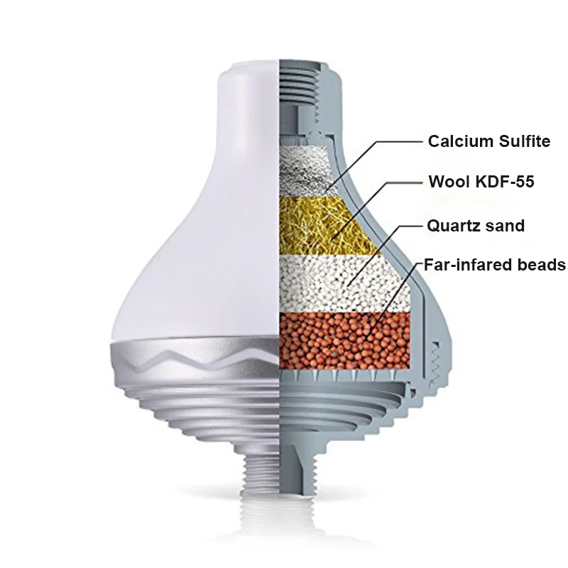 1-й сульфит кальция: Значительно снижает уровень хлора и других вредных соединений в вашей душевой воде, Вы избегаете дальнейшей интоксикации и улучшите свое здоровье 2-е KDF-55: Удаляет 99% вредных хлора и ионов тяжелых металлов, таких как Zn2 +, Hg2 +, Cu2 +, Cd2. Попрощайтесь с сероводорода, свинца, ртути, мышьяка и других металлов через химическую реакцию редокса. Уменьшает воздействие Radon и препятствует росту плесени, грибков и водорослей Уменьшает извести и нарастание масштаба для уборки насадки для душа и приспособления для ванной комнаты 3 кварцевого песка: Адсорбирующий хлор, неприятные запахи и другие примеси. 4 из дальних минеральных бусин; Выделяет дальнюю инфракрасную энергию и увеличивает потребности здоровых людей в активных минералах, помогает «зарядить» воду, уменьшая водную структуру, придавая воде для душа более мягкое, нежное ощущение кожи.