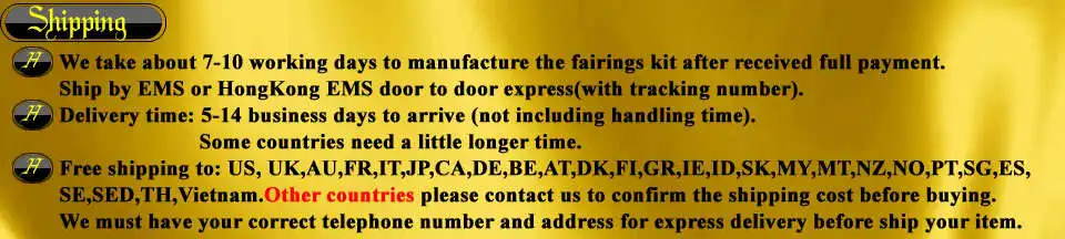 Заявление:Этот комплект обтекателя является aftermarket обтекатель, сделанный в Китае (не OEM или оригинал), 95%-98% такой же, как оригинальный обтекатель. Все детали имеют ту же толщину, что и оригинал,100% приспособление.
