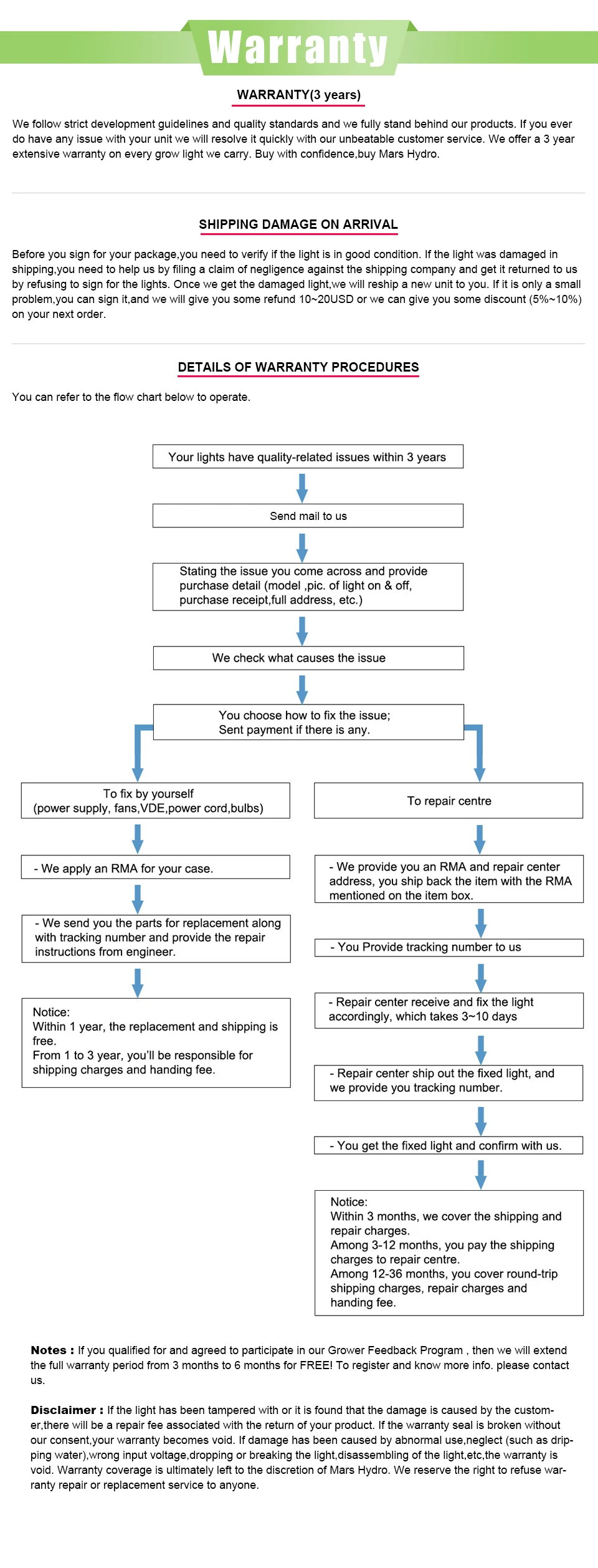 Примечания: Если вы квалифицированы и согласны принять участие в нашей программе отзывы производителей, то мы продлим полный гарантийный срок от 3 месяцев до 6 месяцев бесплатно! Чтобы зарегистрироваться и узнать больше информации. Пожалуйста, свяжитесь с info@mars-hydro.com