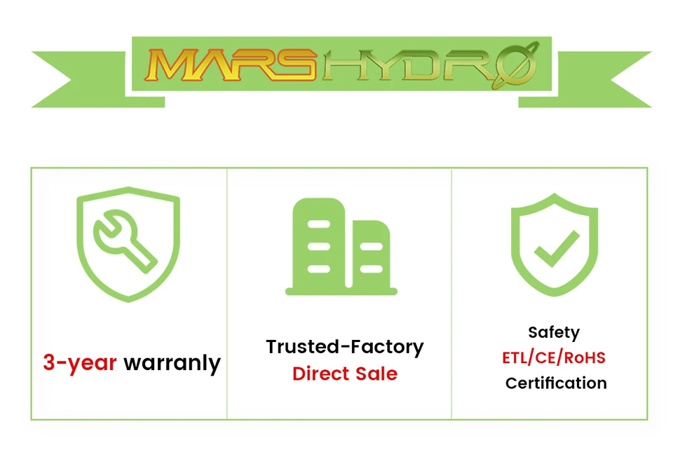Мы следуем строгим инструкциям по разработке и стандартам качества и полностью поддерживаем нашу продукцию. Если у вас возникнут какие-либо проблемы с вашим блоком, мы быстро решим их с нашей непревзойденной службой поддержки клиентов. Мы предлагаем 3 года гарантии на каждый светильник для выращивания. Покупайте с уверенностью, покупайте Mars Hydro.