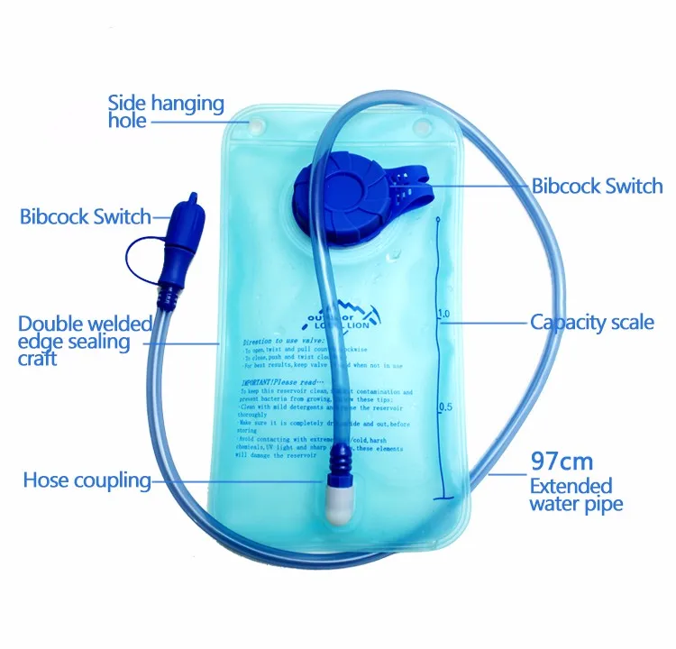 Емкость: 1л/1.5л 1Л размер сумки для воды: 17*30 см (Ш * л) 1.5л размер сумки для воды: 17*35 см (Ш * л) Использование: Спорт на открытом воздухе, езда на велосипеде, бег, туризм, кемпинг, альпинизм и т. Д.