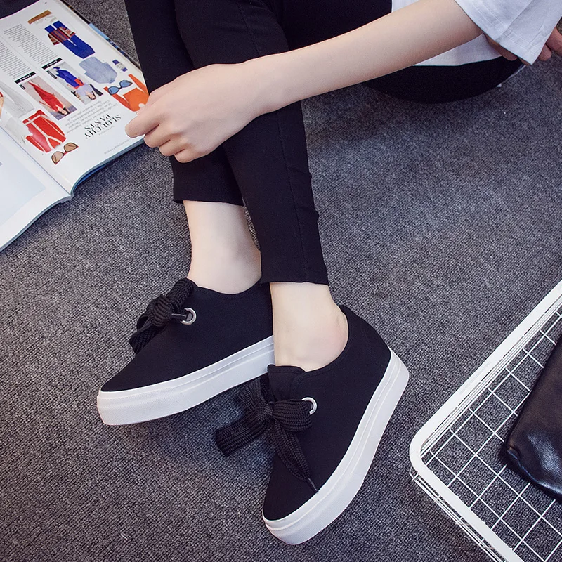 Free Shipping Women Trendy Canvas Casual Shoes with Bow-tie Platform Lace-up Canvas Outdoor Shoes White/Black Size 35~40