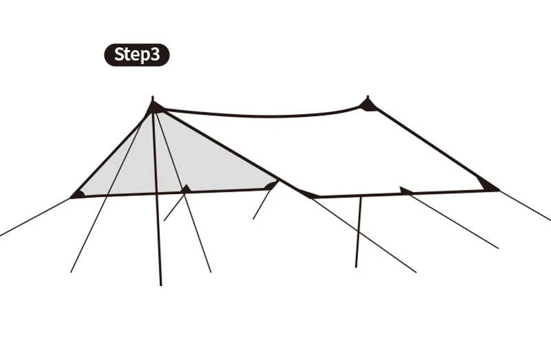 1. Откройте и накройте тент, и соберите полюсы. 2. Поместите палки в пряжку и закрепите ее. 3. Затяните его веревками и закрепите гвоздями.
