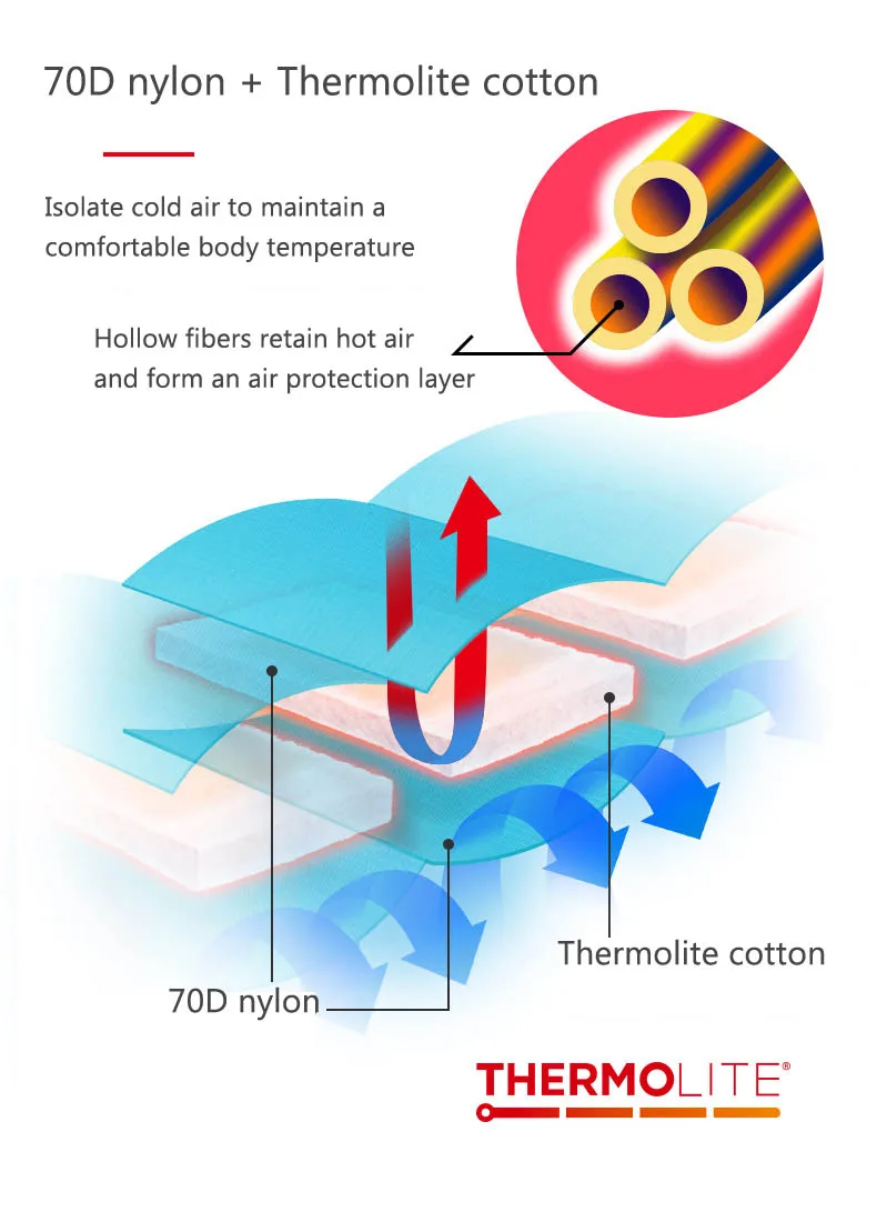 Изолируйте холодный воздух для поддержания комфортной температуры тела Полые волокна сохраняют горячий воздух и образуют слой защиты воздуха