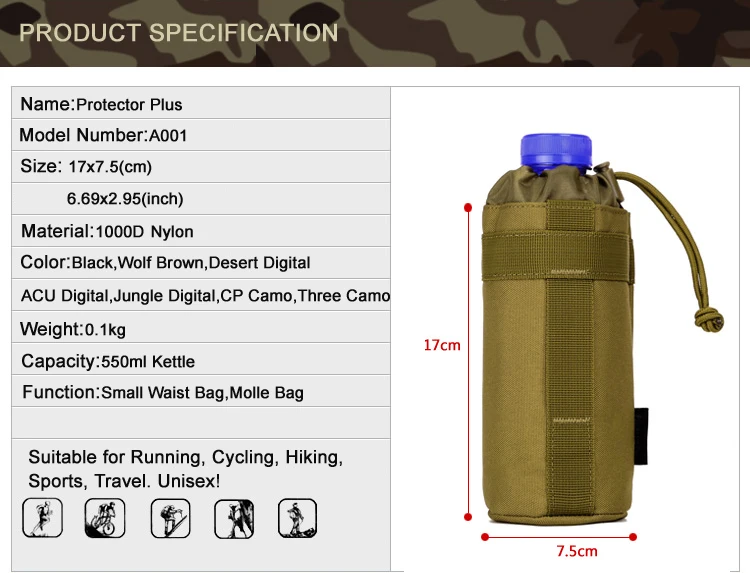 | Наименование товара: Протектор Плюс поясная сумка, сумка для водыМатериал: прочная нейлоновая тканьПодкладка: высококачественный мерсеризованный хлопокРазмер: Длина: 7,5 см, Ширина: 7,5 см, высота: 17 смВес: 100 гШирокие ремни с расширяющейся функцией MOLLE Хорошо проветриваются Регулируемый поясной ремень Примечание 1: цвет может немного отличаться из-за настроек монитора компьютера. Примечание 2: при разнице в способе измерения допускается отклонение в размере на 1-3 см. Примечание 3: новая сумка только что пришла с фабрики, поэтому может быть небольшой запах. |