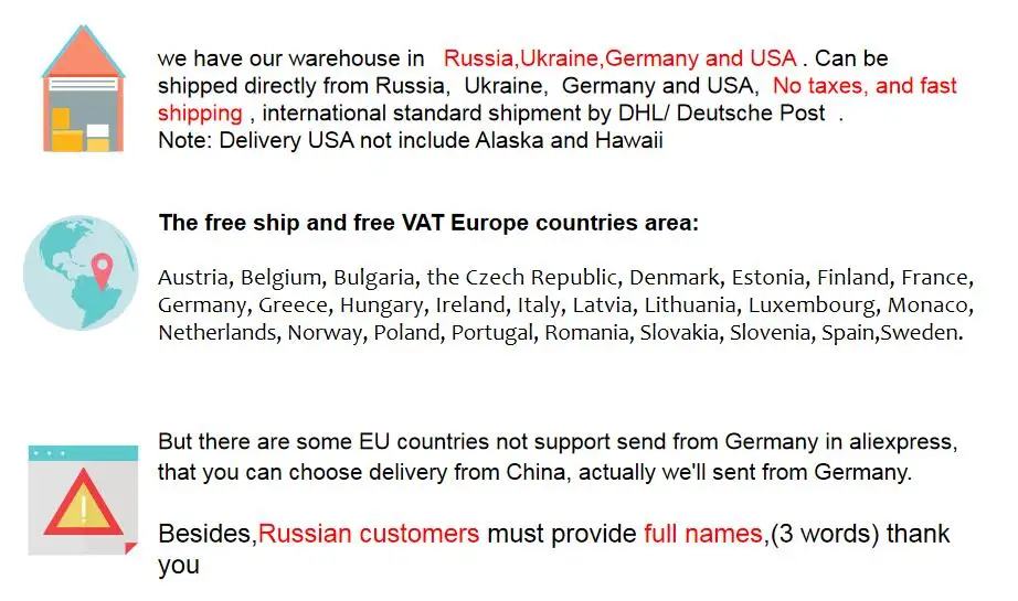 При весе менее 2 кг Мы обычно отправляем авиапочтой Гонконга, которая занимает 10-15 рабочих дней. Некоторые области могут быть позже из-за разницы почтовой службы в различных областях, если более 2 кг Мы можем отправить DHL/UPS/EMS, которые должны подтвердить нами