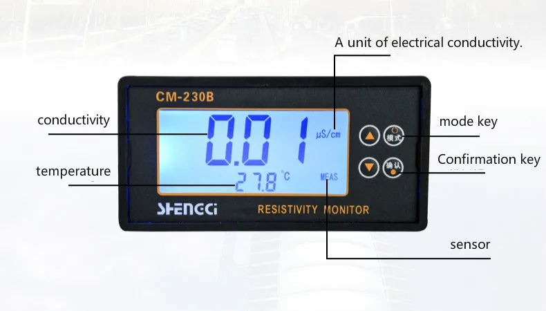 CM-230, диапазон ручного измерения не влияет на температуру.CM-230B, Автоматический диапазон температуры. Параметры продуктаМодель: CM230 (руководство), CM230B (Автоматизация)Диапазон измерения: 0-19,99 0-199,9 0-1999us/смТочность: 2.0% (FS)Стабильность: +/-1%(FS)/24hЭлектрод постоянной: 1,0 смЭлемент компенсации температуры: NTCДиапазон отображения температуры: CM230B:0-60 CСредняя температура: 5-50 сРазмер резьбы: G1/2 резьба трубыСреднее давление: 0-0,5 МПаДлина кабеля: 5 м. (Для другой длины кабеля, пожалуйста, свяжитесь с продавцом перед оформлением заказа)Компенсация температуры: Автоматическая компенсация в зависимости от температуры 25Дисплей режим: 31/2 ЖК-дисплейВыходной сигнал: 4-20 мАИсточник питания: 220 В переменного тока +/-10% 50 ГцПотребляемая мощность: 1 ВтУсловия окружающей среды: (1) температура 0-50 с, (2) Влажность: менее 80% относительной влажностиРазмер формы: 48x96x100ммРазмер отверстия: 45x91ммМатериал: пластик