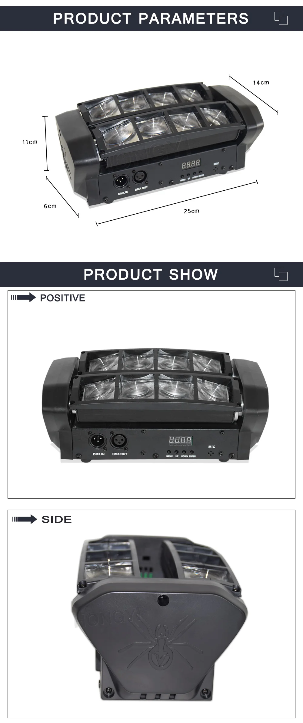 -3 режима работы: режим показа, активный режим звука и управление DMX