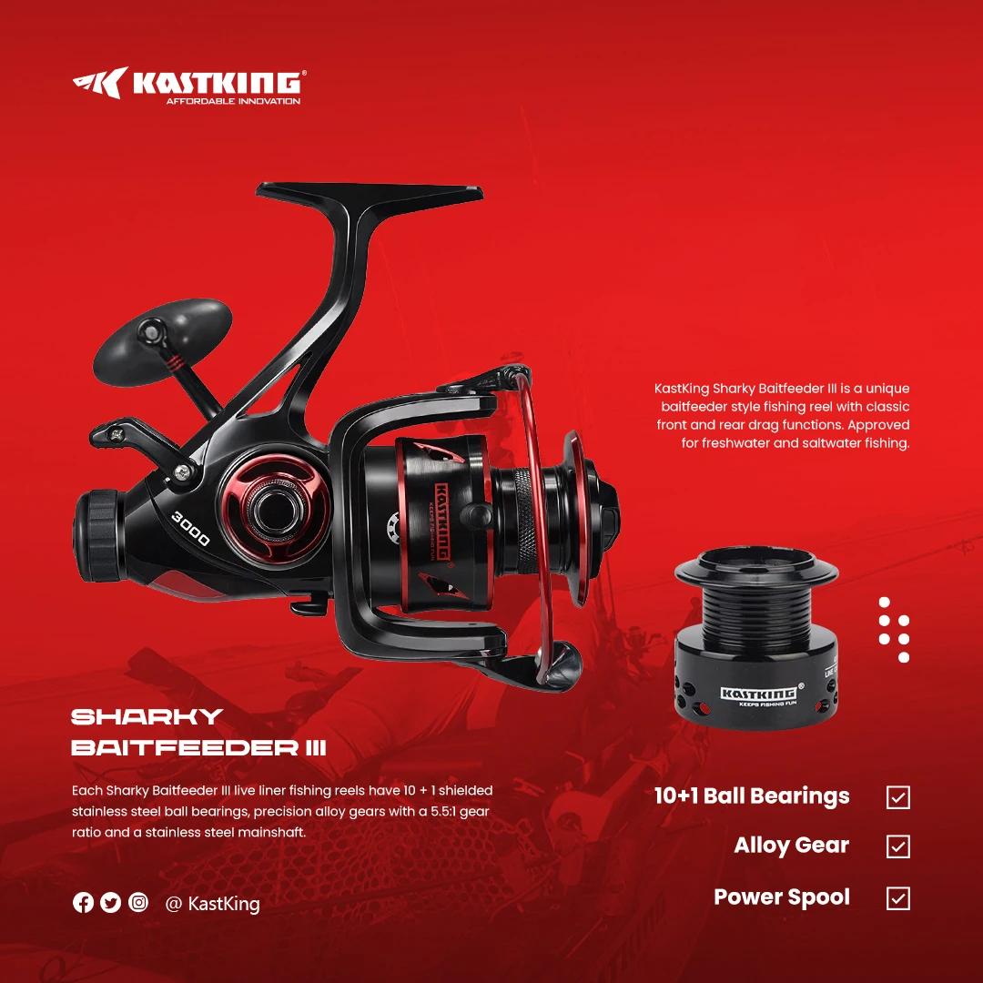 KastKing does it again! The all new and improved KastKingSharky swims into the baitfeeder fishing reel scene for 2017 as the KastKingSharkyBaitfeeder III spinning reel. SharkyBaitfeeder III features 10+1 shielded stainless steel ball bearings, carbon fiber front drag with up to 26.5 Lbs of drag power, and a baitfeeder rear drag system for live lining live bait or drifting cut bait.