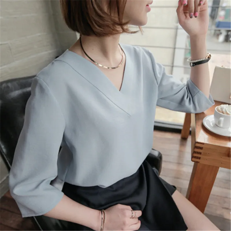 2017 шифоновая блузка с коротким рукавом, женские летние топы с v-образным вырезом, свободная серая белая рубашка, элегантные женские блузки, сорочка Femme