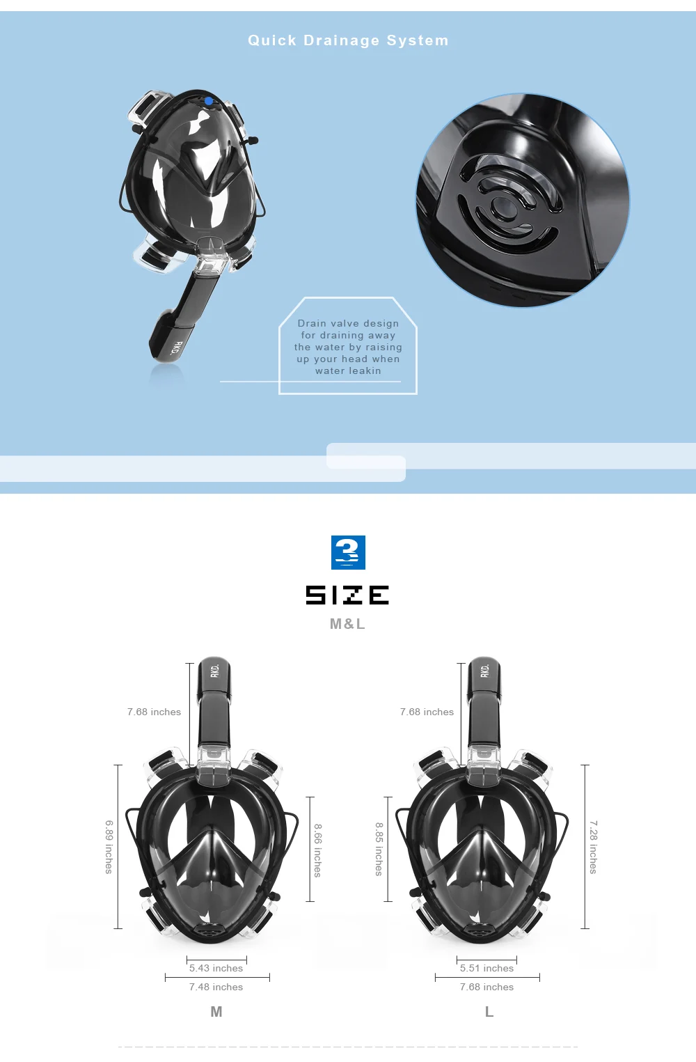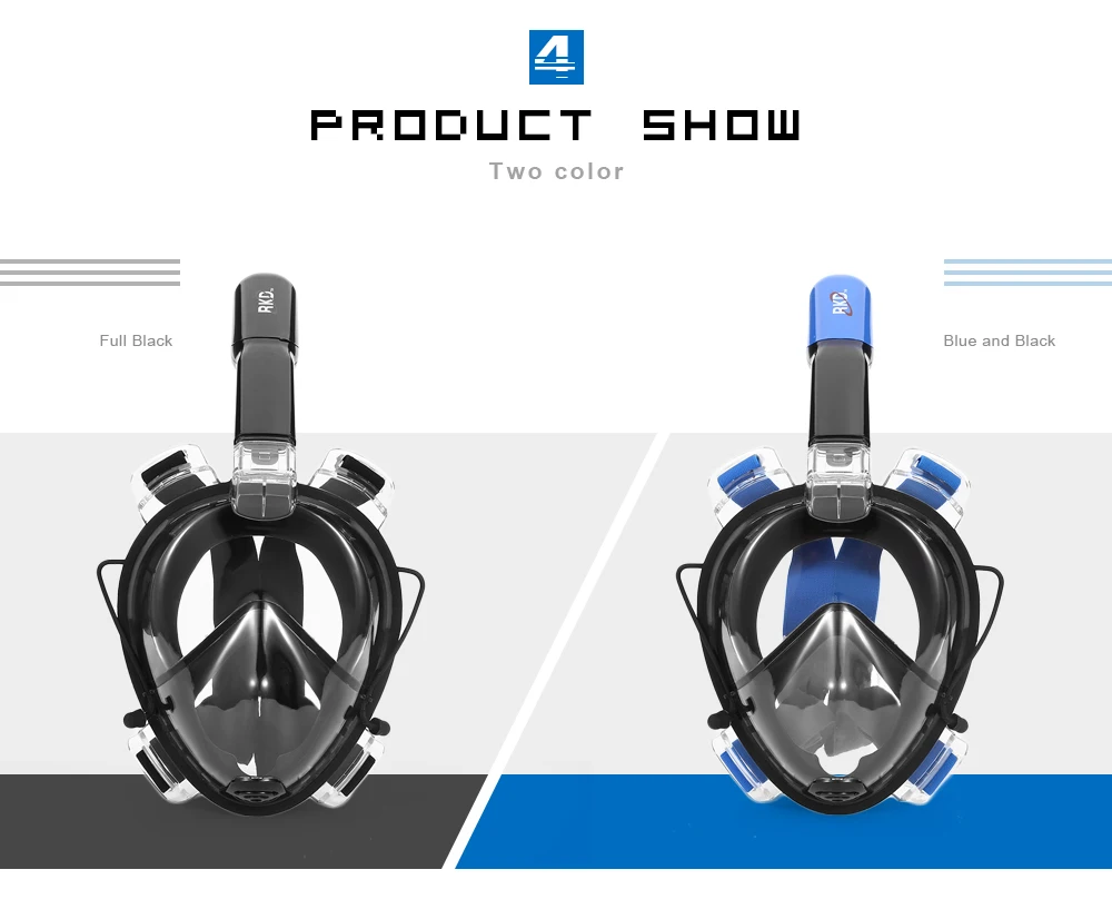 | Посылка Содержание | 1 x маска, 1 x трубка, 1 x крепление для камеры, 2 x анти-плавательная маска, 1 x сумка для хранения, 1 x руководство на английском языке |