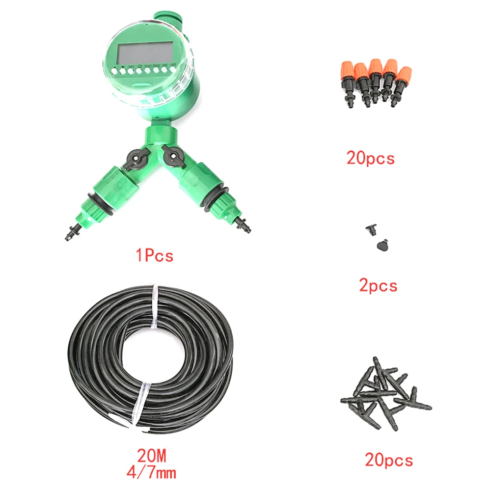 20 м 4/7 мм шланг микро Полив Таймер Y соединитель капельного спринклера садовые наборы для полива Посылка включает в себя: 1x электронный таймер управления спринклером (таймер орошения) - (батарейки в комплект не входят) 1x Y разъем 2x для быстрого разъема 4/7 или 8/11 мм 1X 20 м 4/7 мм шланг 20X желтый спринклер, 20X 4/7 мм Т-образная, 20X двойной проход