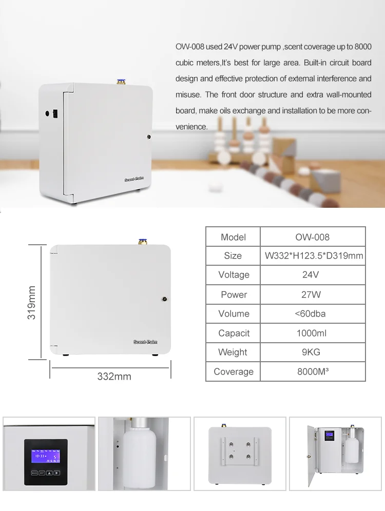1. Охват ароматом: до 8000 куб. М2. Регулируемые настройки интенсивности запаха3. Переменный ток подключается и работает отдельно4.Встроенная система управления временем, настройка рабочих периодов доступна на каждый день, обеспечивает гибкое использование.5. Применение 24V мощность насоса, он работает лучше