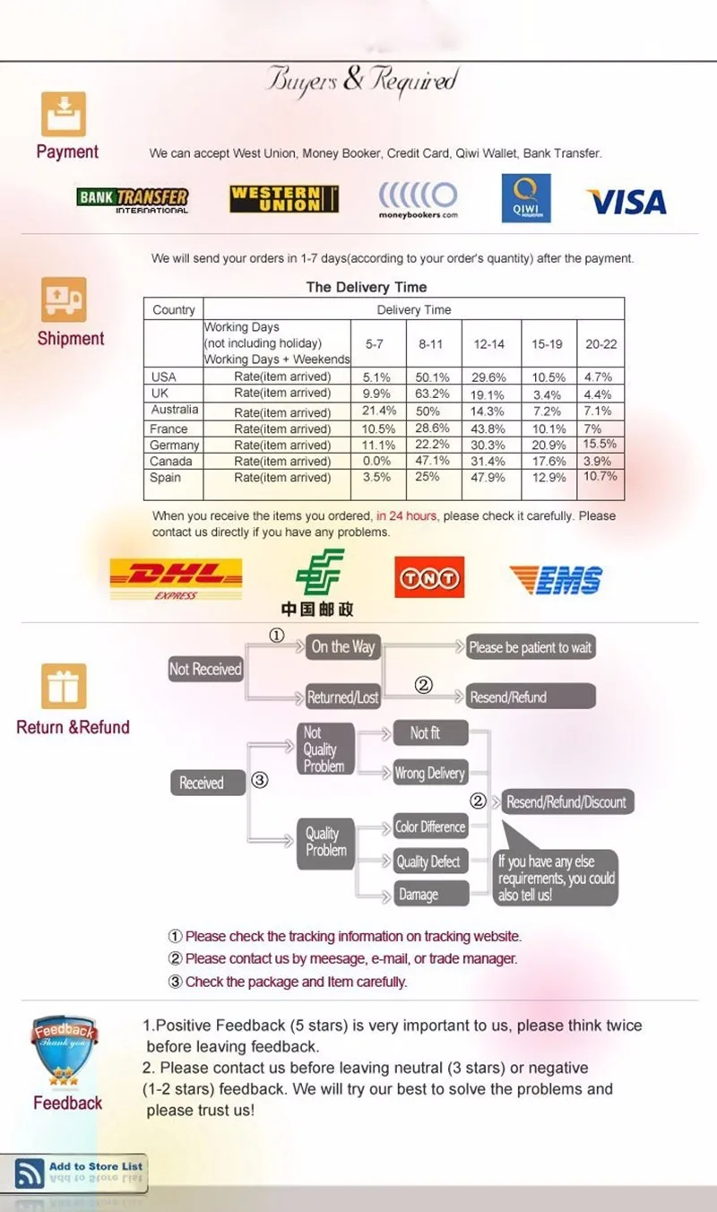 3. Пожалуйста, свяжитесь с нами, прежде чем оставить нейтральный (3 звезды) или отрицательный (1-2 звезды) отзывы, мы постараемся сделать все возможное, чтобы решить проблему для вас, пожалуйста, доверьтесь нам :)