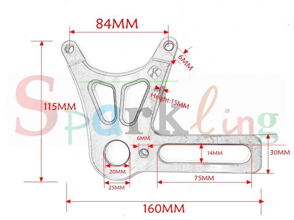 Название продукта: кронштейн заднего тормозного суппорта/код передачи Материал: 6061 алюминиевый сплав Количество: 1 шт. Подходящий диск: для заднего диска 220 мм. Расстояние между монтажными отверстиями: 84 мм Диаметр монтажного отверстия: 20 мм Подходящие модели: Honda MSX125/Grom125 M1/M3/M5 электрический мотоцикл Примечание: Пожалуйста, подтвердите размер вашего мотоцикла перед покупкой.