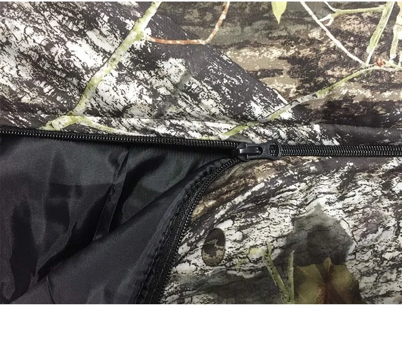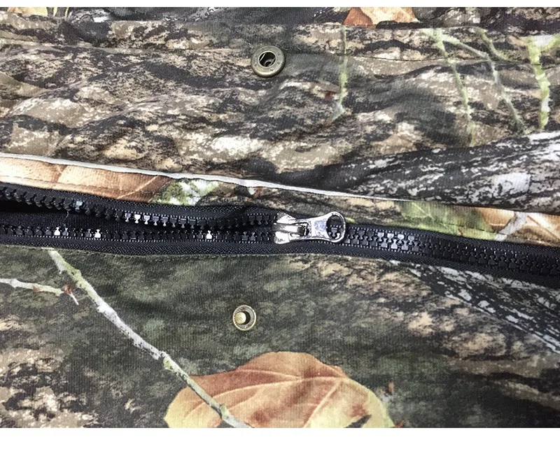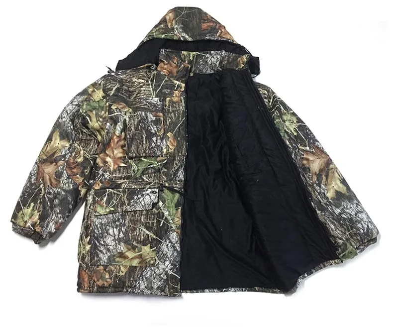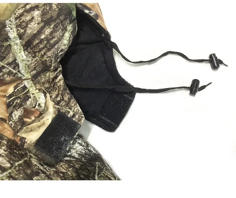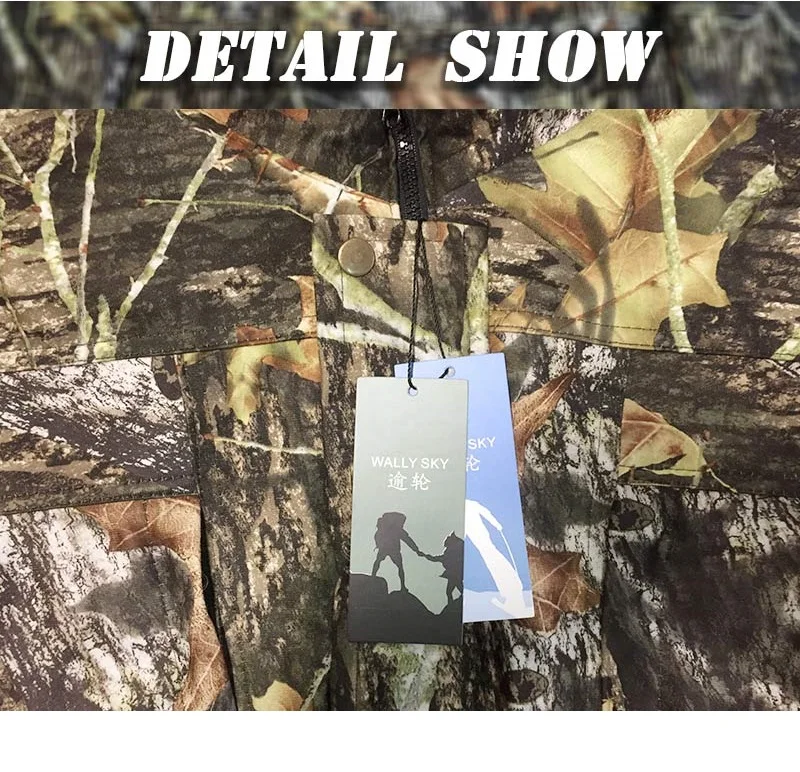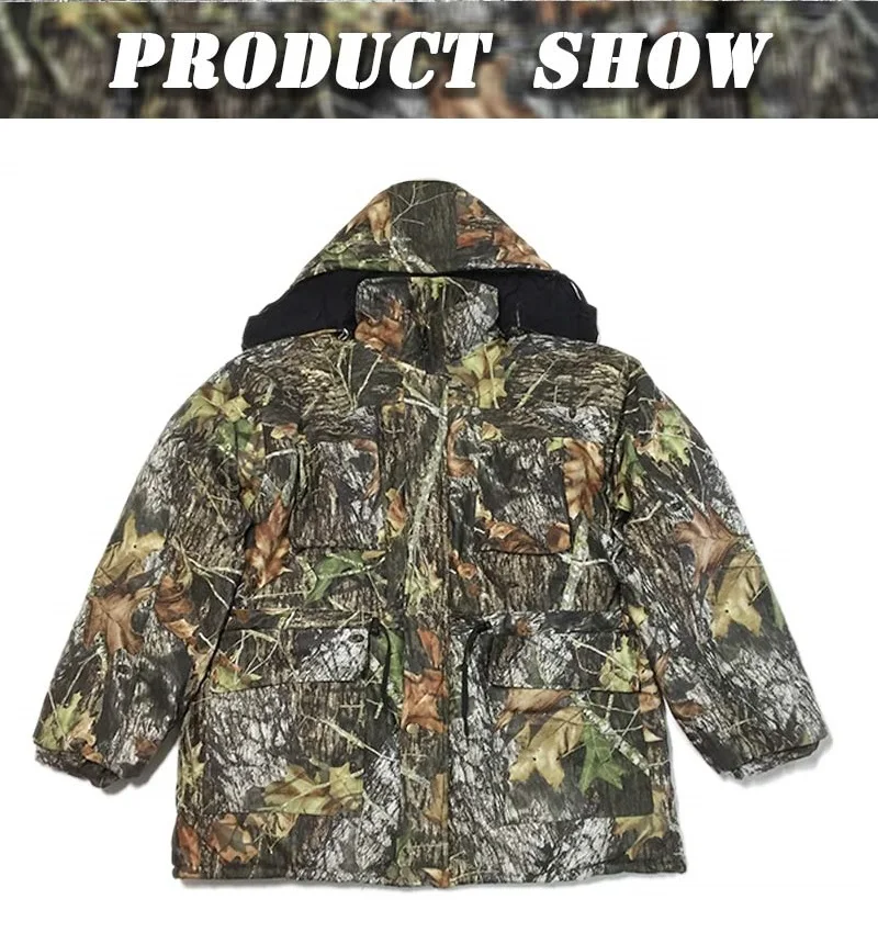Тип изделия: Камуфляжный охотничий костюм Модель: CSN-013 Материал: хлопкополиэфирная ткань; Капюшона: съемный капюшон Цвет: джунгли камуфляж Узор: ветка и листья Сезон: зима Особенности: ветрозащитный, дышащий, тепловой Подходит для: охоты/кемпинга/альпинизма/катания на лыжах Посылка включает в себя: пиджак + брюки