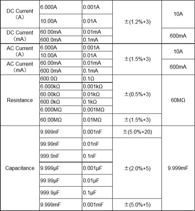 Brand NameZOYIModel NumberZT101 ZT102 ZT102AOriginMainland ChinaCertificationCEDimensions65x130x32 mmDIY SuppliesELECTRICALIs Smart DevicenoOperating Temperature0 - 50 ℃Measuring Resistance Range600/6k/60k/600k/6M/60MMeasuring Capacitance Range10nF/100nF/1uF/10uF/100uF/1000uF/10000uFMeasuring Inductance RangenoDisplay TypeDigital DisplayOperating Modedouble-integral style A/D transformMeasurement unitpiece/piecesEach pack1Battery2x 1.5V AAA ( not include)Frequency1Hz to 10MHzDC Voltage meter600mV/6V/60V/600V/1000VDC Millivolt600mVDC Millivolt (true RMS)600mVDirect Current meter60mA/600mA/10AAlternating Current60mA/600mA/10ADiode TestYesMeasuring Current Range600mA/60maA/6A/10AMeasuring Voltage Range600mV/6V/60V/600V/1000V