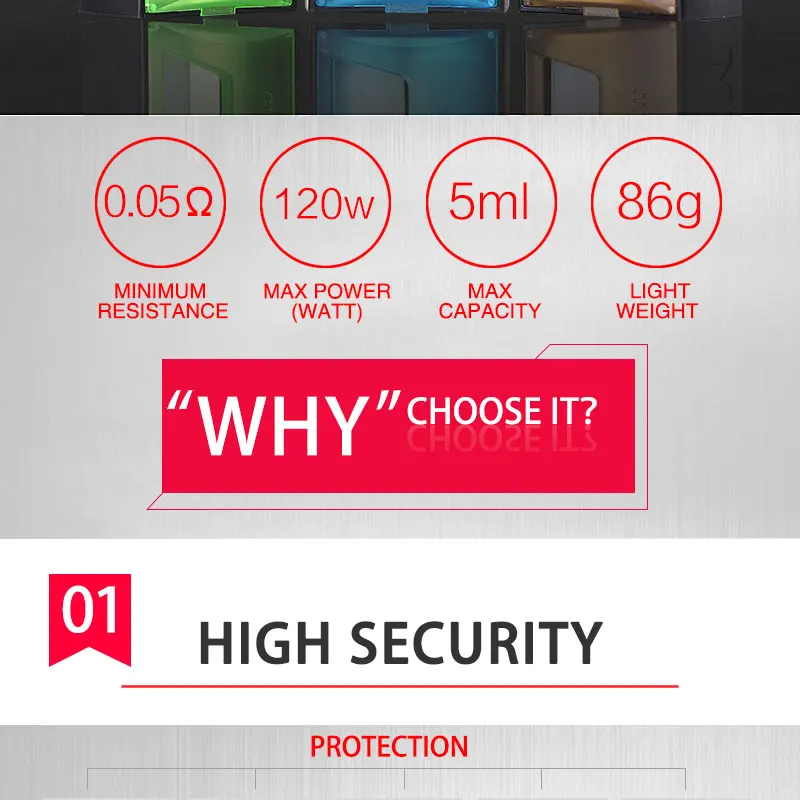 Диапазон напряжения: 3,2-4,2 В Диапазон сопротивления: 0,05-3 ом Поддержка катушки: Kanthal, Ni200, Ti, SS и т. д. Максимальная мощность: 120 Вт Диапазон защиты: 90 oC-110 oC Размер: 80x49x30мм Вес нетто: 86 г