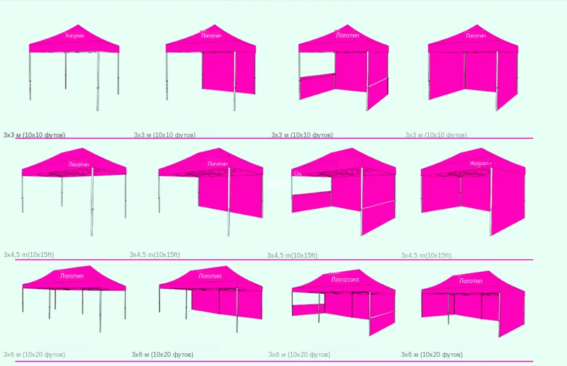 Доступные размеры comon включают:1,5x1,5 м, 1,5x2,4 м, 2x2 м, 2,5x2,5 м, 3x3 м, 3x4,5 м, 3x6 м, 4x4 м, 4x6 м, 4x8 м, 2 м шестиугольный, 3 м шестиугольный.