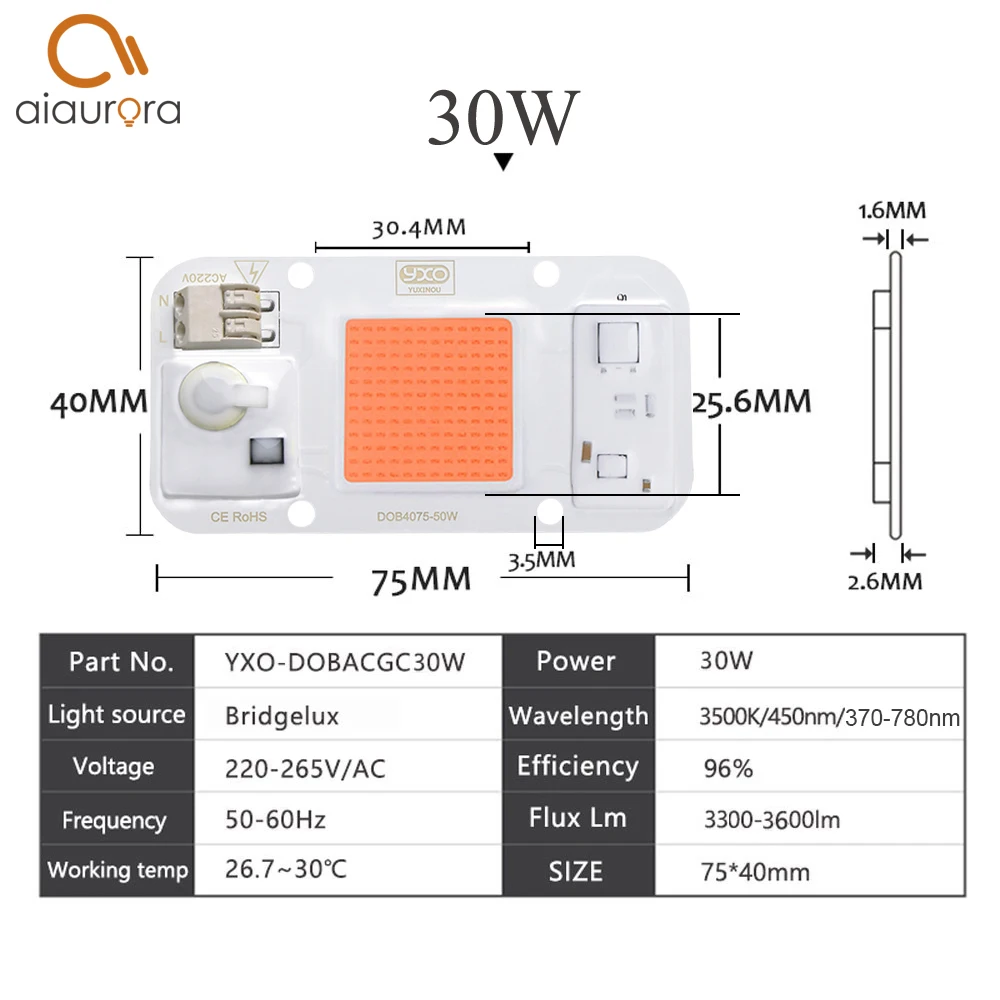 2. Цвет:Полный спектр380-840нм3.Фосфор: 660нм (другой поставщик использует 620нм, так что это дешево)4. Чип: Bridgelux5. Мощность: 20 Вт/30 Вт/50 Вт6. Входное напряжение: 220-277 В7.Размер:78x44x1.6 мм8. Материал корпуса: алюминий9. Срок службы от источника энергии:> 50000 часов10. Угол освещения: 12011. Гарантия: 3 года12. Почему наш светодиодный чип лучше, чем другой чип, потому что это новая технология DOB, есть 6 функций для защиты светодиодного чипа длительный срок службы.A1:MOV для защиты от перенапряжения> 4000 в прошелA2:1000V Мостовой выпрямительA3: постоянный ток и постоянный контроль мощностиA4: Датчик NTC для защиты от перегрева pcbA5: регулятор напряжения для ic vdd protectioA6: Драйвер IC, перенапряжение и контроль над токомПримечание:Для Охлаждения необходим алюминиевый радиатор, не используйте светильник без радиатора.Канал заказа радиатора: https:/item/20W-30W-50W-60W-LED-aluminum-Heatsink-radiator-heatsink-with-fan-led-radiator-for-led-full/32829070741.html?spm=2114.10010108.1000023.3.3f5d9e3ccBckCSРадиатор 12 в драйвер вентилятора:https:/store/product/12V-10W-Fans-driver-Power-supply-High-Speed-Fans-for-led-grow-light-chip-small-driver/903774_32616718769.html?spm=2114.12010612.0.0.316022b1Nur8vqВставить ссылку на заказ: https:/item/3pcsx5g-Thermal-Pads-Conductive-Heatsink-Plaster-Viscous-Adhesive-For-Chip-CPU-GPU-VGA-RAM-LED-IC/32605626968.html?spm=2114.12010108.1000023.15.3a5f55e8O7nXkp