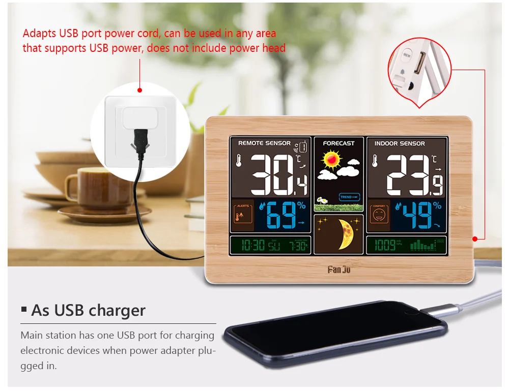 1. Функция прогнозирования погоды; 2. Время в дополнительном 12/24 часовом формате.; 3. Зарядное устройство USB для электронных устройств.; 4. Температура в помещении/на улице (° C или ° F) и влажность. Диапазон измерения температуры в помещении: 14 F ( -10 C) ~ 122 F ( 50 C ), диапазоны измерения температуры вне помещения: -4 F ( -20 C) ~ 122 F ( 50 C ), диапазон измерения влажности в помещении и на улице: 20% RH ~ 95% RH; 5. Барометрическое давление, температура и оповещение о заморозке. Появляется символ ice alert и звучит сигнал тревоги, когда наружная температура на 30 F (-1 C )~ 37 F( 2 C ); 6. Минимальное/Максимальное отображение влажности воздуха и температуры; 7. Трендовое отображение давления воздуха, температуры и влажности; 8. Отображение уровня комфорта в помещении по знаку лица. В/вне помещения температура/Влажность/Барометрический тренд отображаются на ЖК-дисплее с 3 сигналами: поднимается, остаётся и падает; 9. Ежедневный будильник с функцией повтора сигнала; 10. Календарь и фаза Луны; 11. 5 уровней яркости подсветки Выберите с адаптером питания.