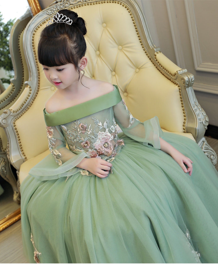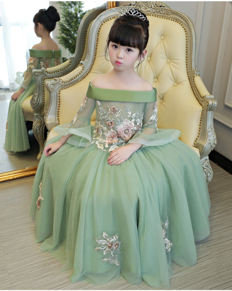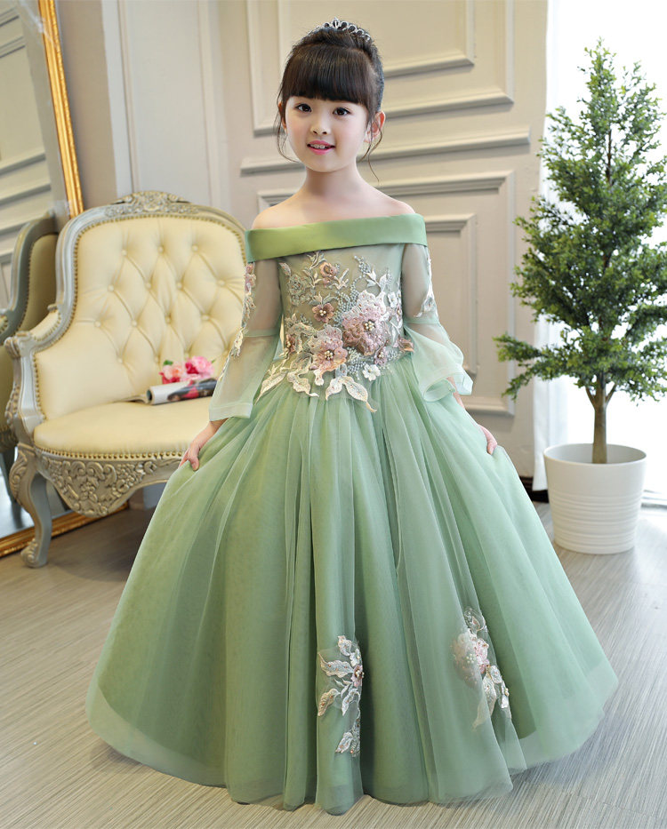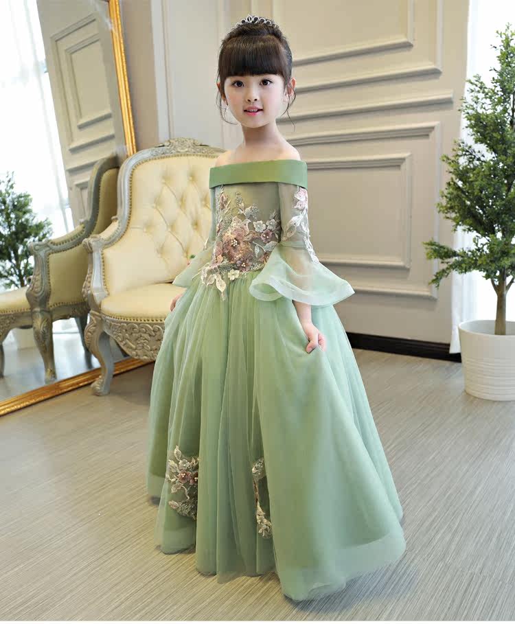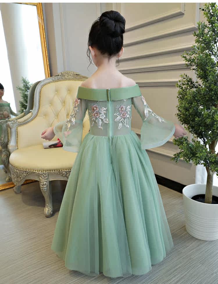 Армейское зеленое платье для девочек, винтажное платье для дня рождения с открытыми плечами, вечернее платье принцессы с цветочной вышивкой, сказочное красивое платье в пол, 2019