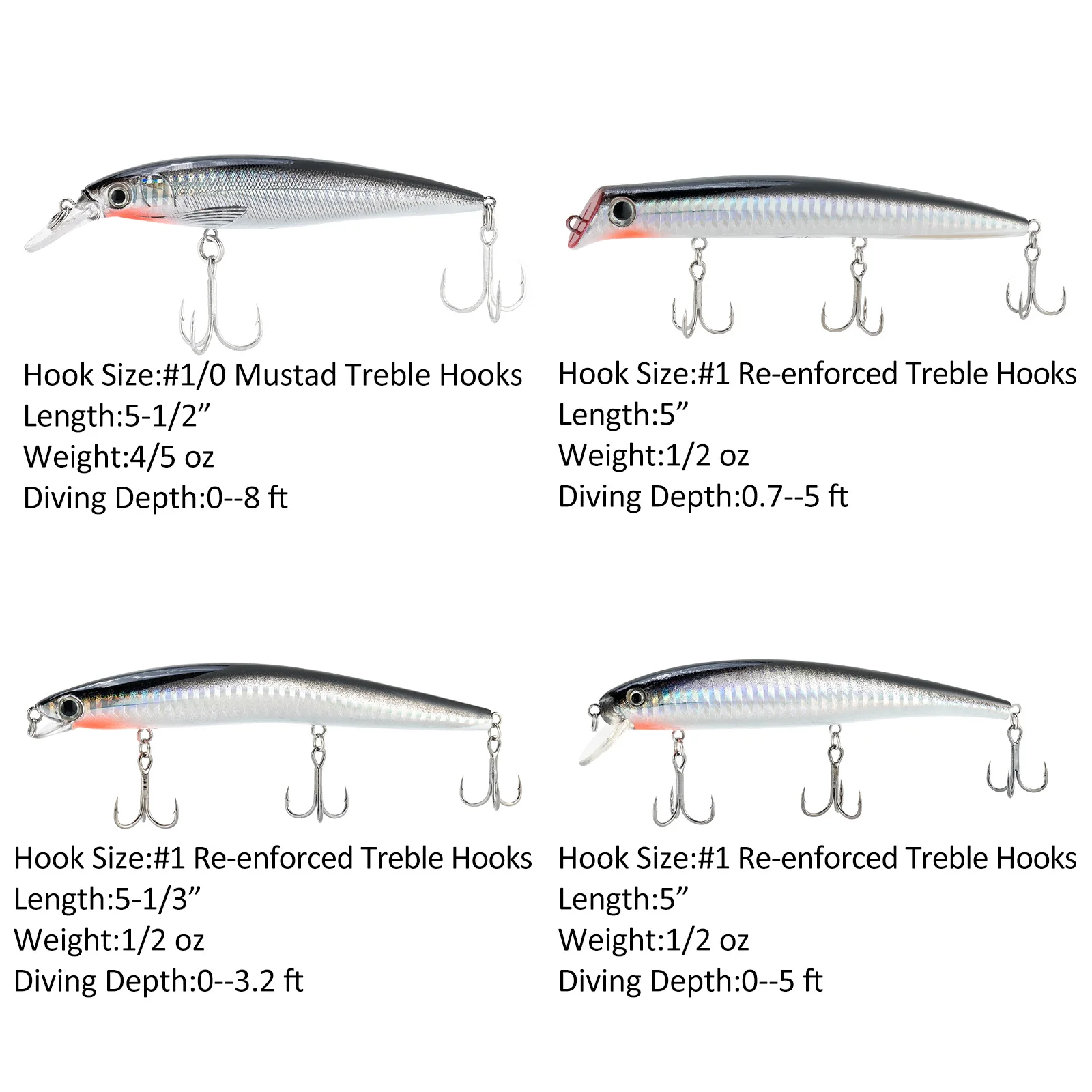 Последняя модификация: 2 из них оснащены тройными крючками Mustad, 2 с сверхпрочными тройными крючками из нержавеющей стали с соленой водой, а два других с острыми тройными крючками. Улучшенная камерная система погремушки, пожизненное плавательное действие в воде.