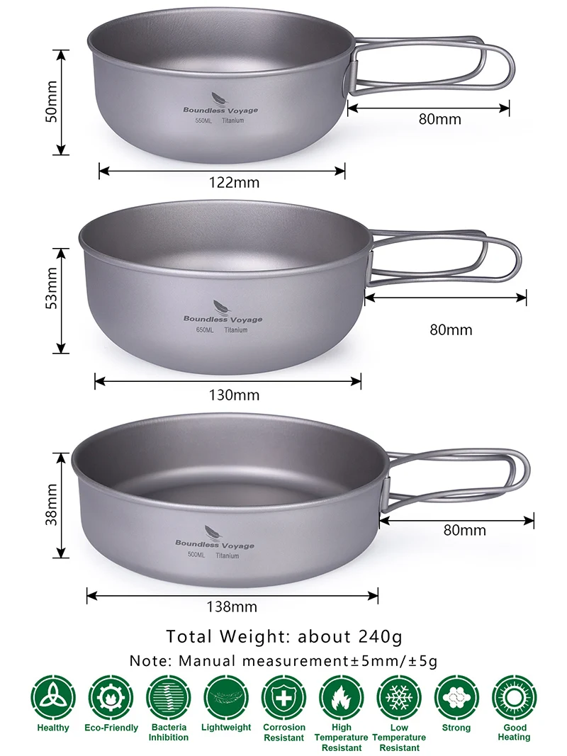 Тип: Ti1571B Материал: чистый титан Вес: 239,5 г Размер: сковорода :( D)138 *(H)38 мм, 500 мл, 79 г Маленькая миска:(D)122 *(H)50 мм, 550 мл, 77,9 г Большая чаша:(D)130 *(H)53 мм, 650 мл, 80,3 г Особенности: Складные ручки легче носить с собой и экономят больше места. Сковорода и чаша, может удовлетворить большинство потребностей. Изготовлен из титаниума, легче носить с собой. О Титане 1. Чистый титаниум, легкий и прочный, чем сталь, гораздо легче и прочнее, чем сталь. 2. Никогда не ржавеет, не подвержен коррозии от кислоты и щелочи. Супер анти-падение и износостойкость. 3. Высокая устойчивость к экстремальным низким и высоким температурам. 4. Хорошая теплопередача, не легко сосать вкус, легко чистить. 5. Здоровый, экологически чистый, близкий к человеческому телу, не вызывает раздражения, не вызывает аллергии. Безграничное путешествие-сертифицированная компания ISO 9001:2008. Безграничное путешествие работает в течение 7 лет, более профессиональное, высокое качество и ценовое преимущество.
