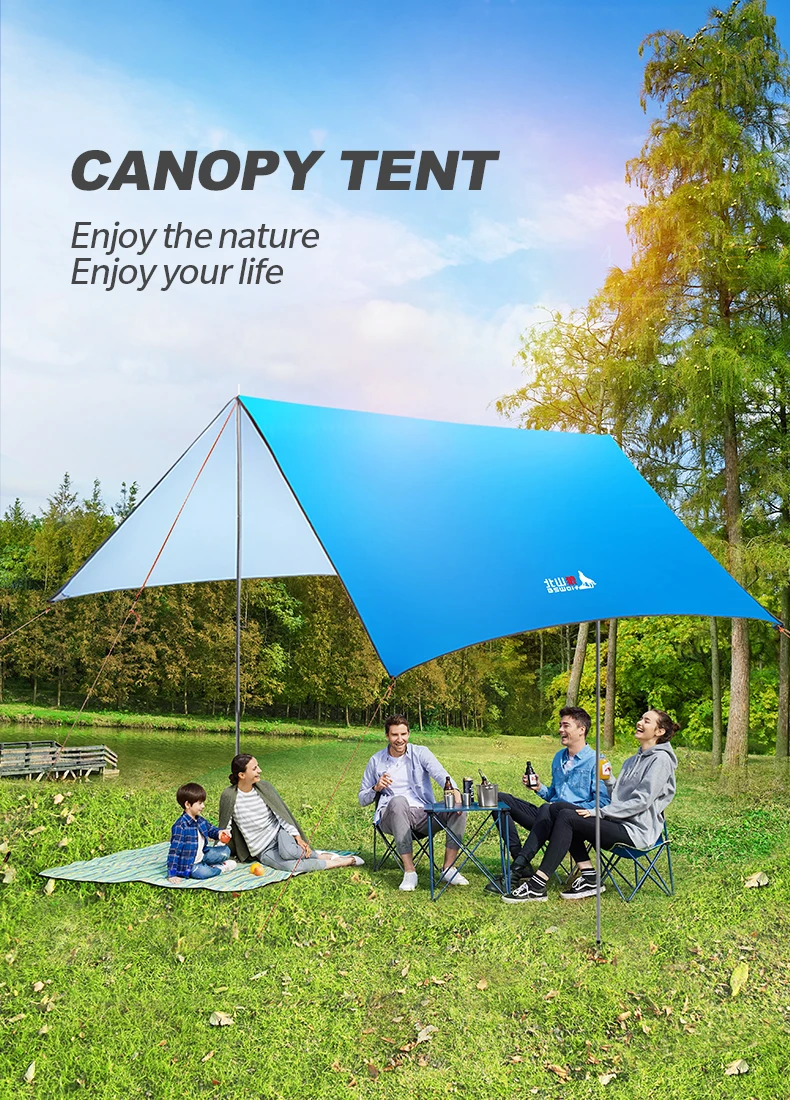 Этот тент очень большой, самая большая площадь покрытия-9 квадратных метров. 190т ткань Оксфорд, устойчивость к истиранию, сопротивление разрыву. Анти-УФ-ткань, блокирующая более 90% ультрафиолетовых лучей; Может быть просто тентом, как ветрозащитная и непромокаемая палатка, палатка для кемпинга для путешествий на открытом воздухе.