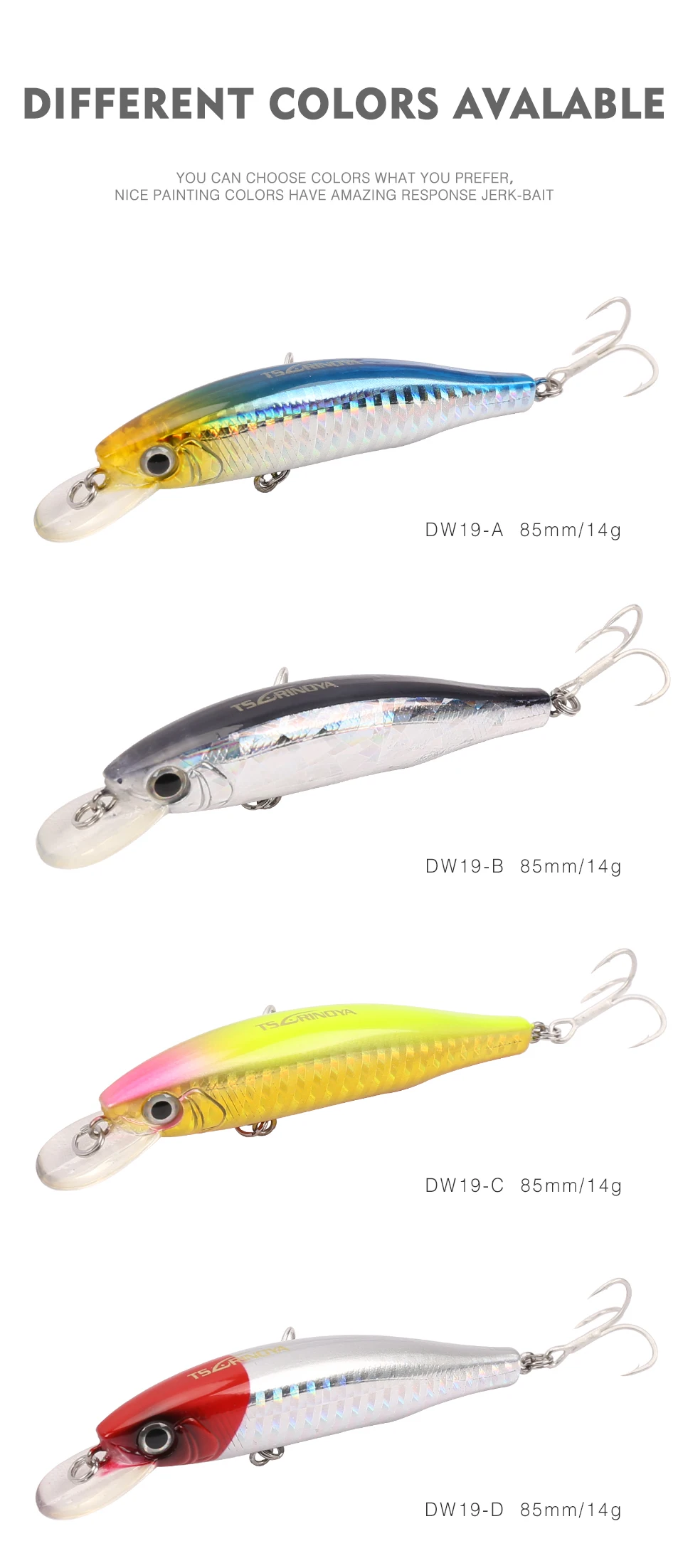 TSURINOYA 80 мм 14 г жесткая блесна приманка для рыбалки глубина погружения 1,0 м искусственная наживка для рыбалки пластиковые Воблеры снасти Peche Pesca Особенности: 1. Внутри приманка оснащена фиксированной системой взвешивания, позволяющей ей утонуть-так же, как погибающая приманка. 2. Изготовлено с ультра реалистичными деталями, чтобы обмануть самых настороженных рыб, приманка имеет 3D глаза, формованные пластины gill и текстурированный рисунок шкалы для максимального притяжения от укуса. 3. Приманка имеет вес хвоста, чтобы обеспечить исключительное расстояние отливки, а также производит громкий звук стука, чтобы помочь вызвать рыбу на больших расстояниях. 4. Приманка имеет обтекаемый дизайн тела, который максимизирует расстояние отливки. 5. Благодаря сверхмощному оборудованию, в том числе тройным крючкам и раздельным кольцам, приманка может справиться с эпическими сражениями от самых сложных боевых хищников зубами. 6. 3D глаза и премиум-краска обеспечивают невероятно реалистичный вид, приманка имеет глубокие блестящие отделки и огромное разнообразие цветов. Подробная информация о продукте: 1. Цвета: A,B,C,D 2. Вес: 14 г 3. Длина: 85 мм 4. Плавучесть: оседающая на дно приманка 5. Глубина погружения: 1,0 м 6. Посылка: 1 шт.