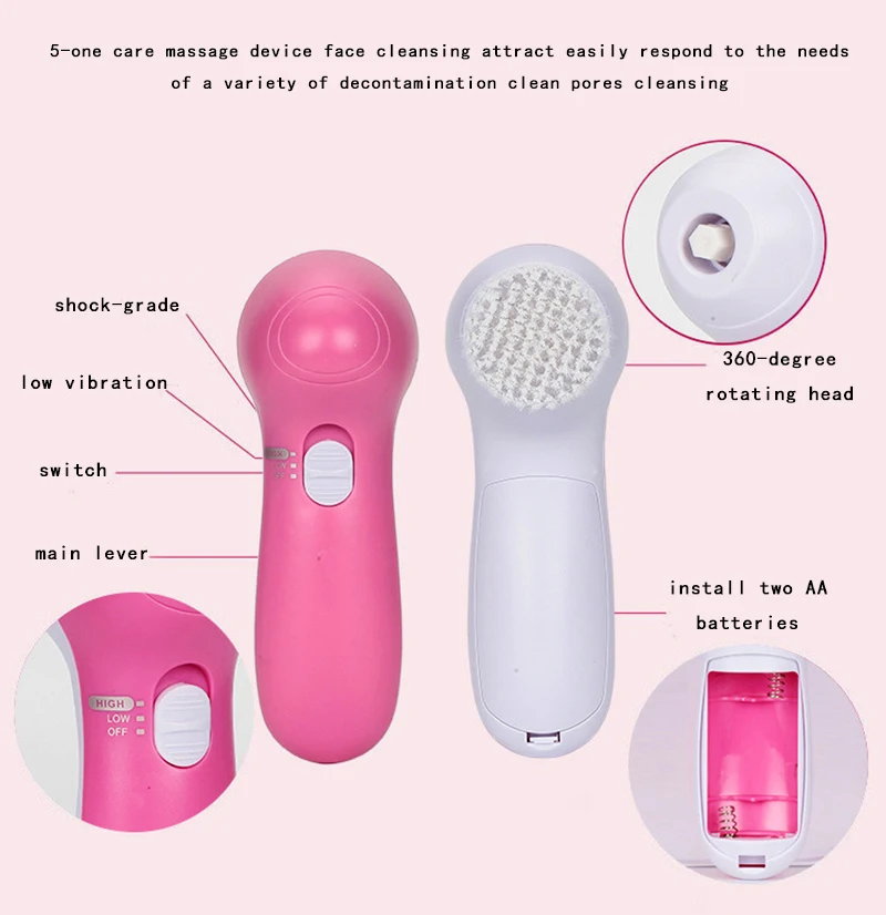 Note: This product is not waterproof, please remember not to put into water. Specifications: 1. Power By : 2 “AA” batteries ( Because air transport restrictions, packaging no batteries!) 2. Operation condition: Temperature 10-40’C (50-104’F), Humidity 30%-90% 3. Color: Pink + White 4. Package size: 130mm x 130mm x 50mm Package include: 1 x Main unit 5 x Attachments: soft brush, Rolling massager, make-up sponge, Latex sponge-soft, Crude Polish accessory.