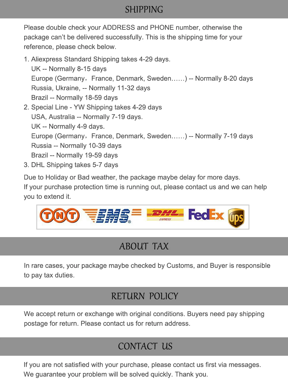 Пожалуйста, выберите размер в соответствии с нашей таблицей размеров, который соответствует размеру, выберите свой обычный размер. Если у вас есть вопросы о размере, пожалуйста, свяжитесь с нами.