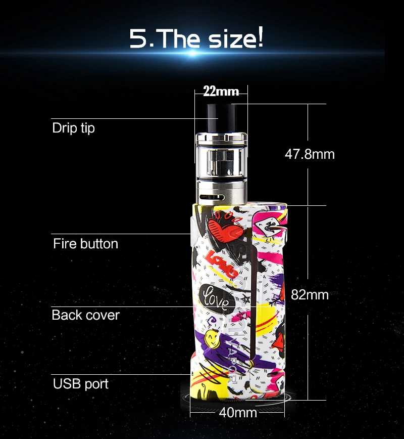 Этот комплект является съемным аккумулятором. Без аккумулятора 18650. Вам лучше купить одну (sonyVTC4/VTC5, LG HE2 и т. д.) батарею 18650 самостоятельно. Мгновенный выходной ток выше или равен 30А будет лучше. Каждый дизайн Граффити Для коробочного Мода уникален, поэтому вы получите все различные моды живописи. Модель спереди и сзади представлена двумя разными красками граффити.