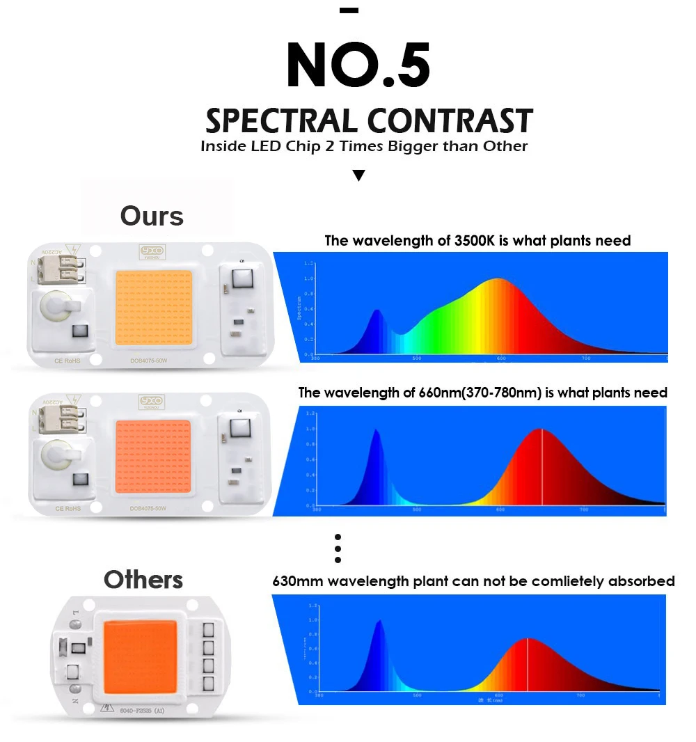 2. Цвет:380-780нм (Для Veg)/3500K (Для Bloom)/450нм3.Фосфор: 660нм (другой поставщик использует 620нм, так что это дешево)4. Чип: Bridgelux5. Мощность: 50 Вт6. Входное напряжение: Переменный ток 110V/220V-265V7.Размер:75x40x1.6 мм8. Материал корпуса: алюминий9.Диммируемая:Да10. Срок службы от источника энергии:> 50000 часов11. Угол освещения: 12012. Гарантия: 3 года13. Почему наш светодиодный чип лучше, чем другой чип, потому что это новая технология DOB, есть 6 функций для защиты светодиодного чипа длительный срок службы.A1:MOV для защиты от перенапряжения> 4000 в прошелA2:1000V Мостовой выпрямительA3: постоянный ток и постоянный контроль мощностиA4: Датчик NTC для защиты от перегрева pcbA5: регулятор напряжения для ic vdd protectioA6: Драйвер IC, перенапряжение и контроль над токомA7: он может использовать светодиодный диммер или диммер SCR для затемнения Температура соединения составляет 120 градусов, рекомендуется, чтобы Максимальная рабочая температура чипа была менее 90 градусов.Примечание:Для Охлаждения необходим алюминиевый радиатор, не используйте светильник без радиатора.Канал заказа радиатора: