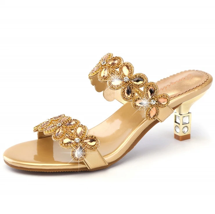 Золотистый и черный Женская пляжная обувь стразы и закрытой пяткой летние сандалии 2020 шлепанцы без задника с открытыми пальцами со стразами сандалии, без застежки, обувь с цветочным принтом, на высоком каблуке