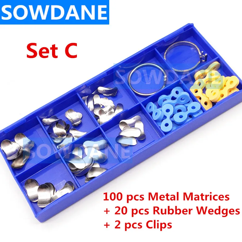 Delta Ring T10369 с двойными зубцами является наиболее подходящим для установки дополнительных клиньевКоличество: один комплектКаждый набор включает:100 матриц + 2 зажима + 20 резиновых клиньев (резиновые клинья могут быть стерилизованы до 138 ℃)Доставка