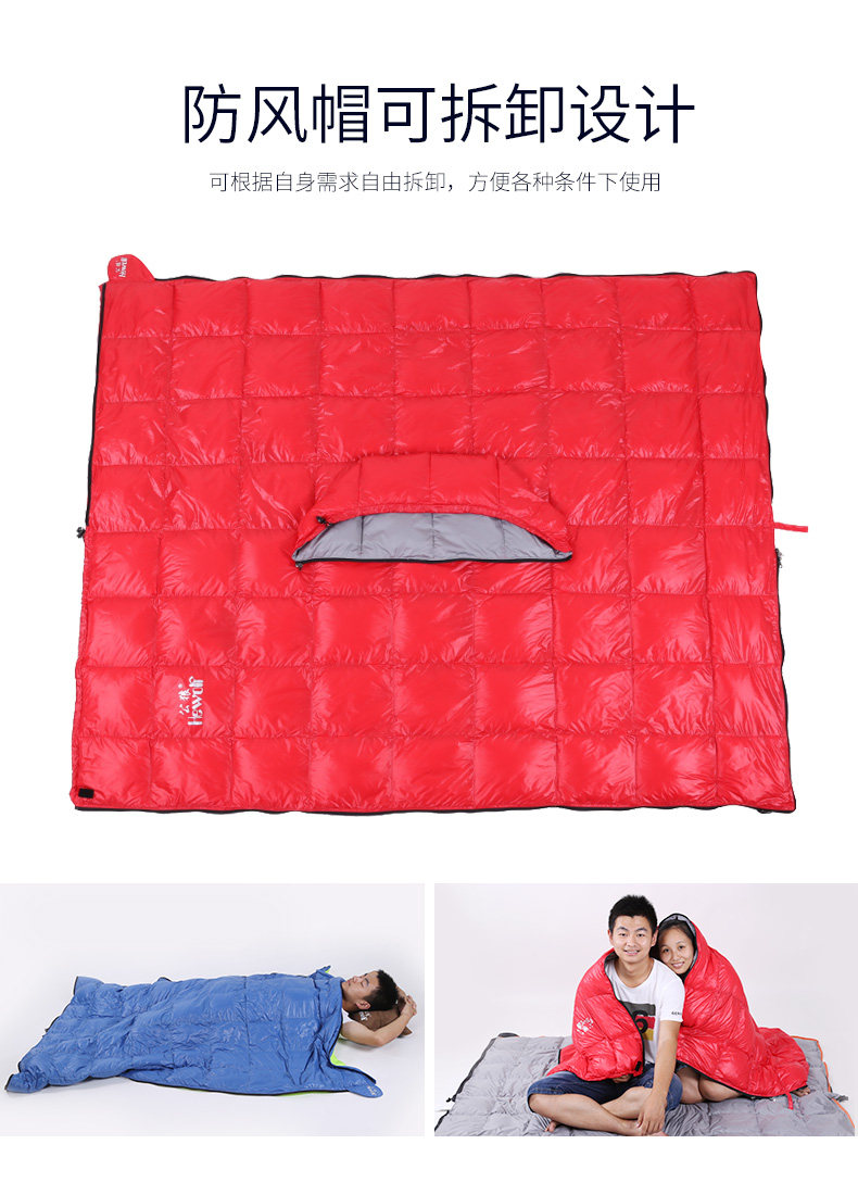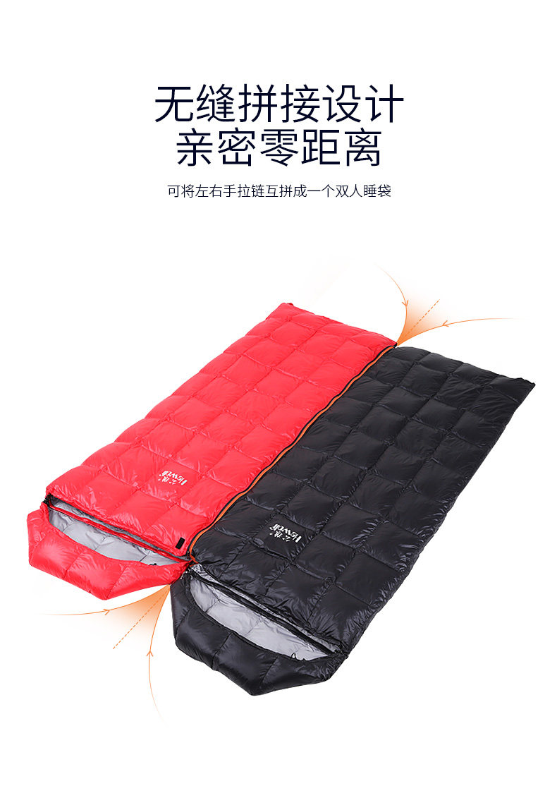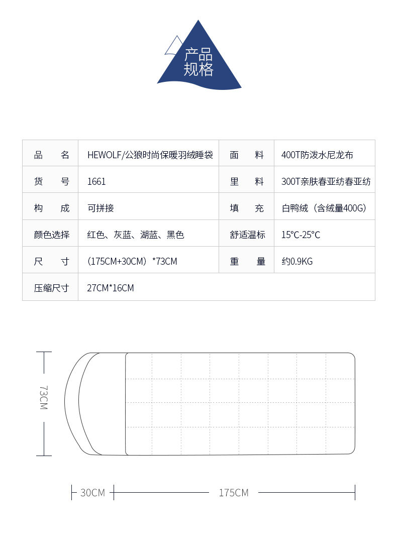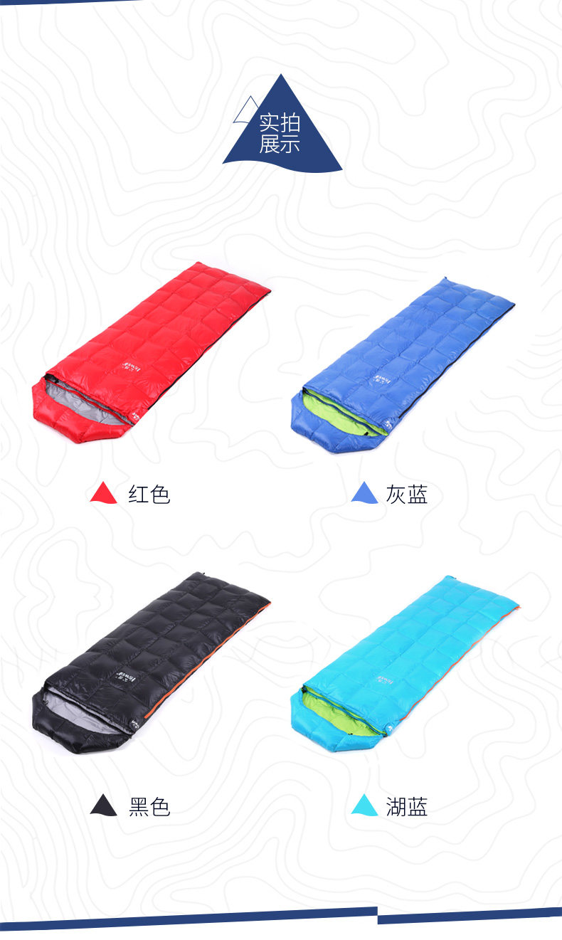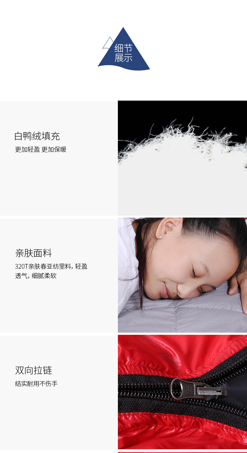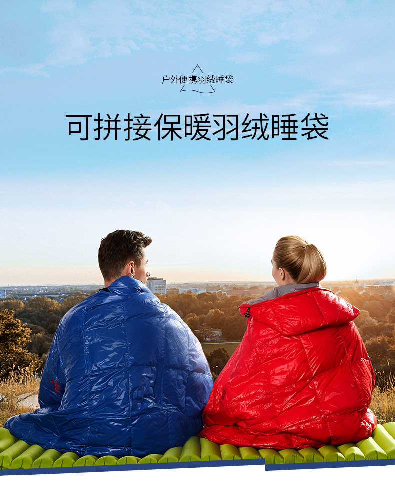 Ткань: 400T Водонепроницаемая нейлоновая ткань Подкладка: 300T pongee Наполнитель: белый утиный пух 400 г Размер:(175 + 30)* 73 см Подходящие температурные Весы: 15 ~ 25C Вес: около 0,9кг Компрессионная сумка: 27*16*16 см Может быть соединены