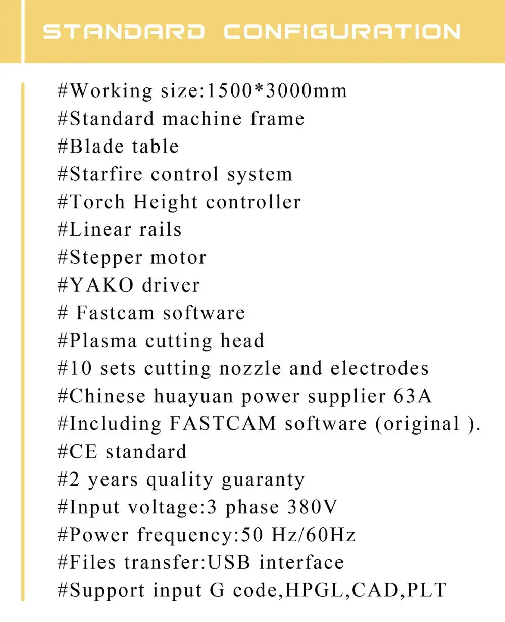 | Тока для плазменной резки: | Китайский Лучший браслет Huayuan:63A (гипертермическая опция США) |