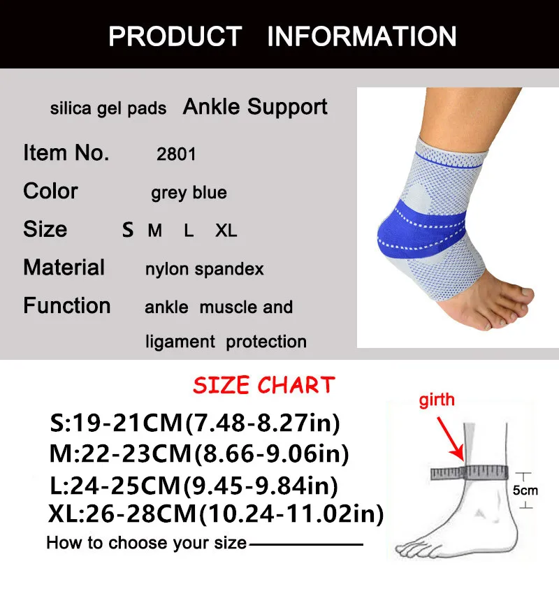 Особенности: 1. Он имеет трехмерного плетения и обеспечивает стандартное давление подачи. 2. Он имеет силиконовый Массажный коврик для того, чтобы возместить ущерб. 3. Изготовлен из дышащая функциональная трикотажного полотна, он имеет отличную вентиляцию и влагоотводящий. Это более Удобная приятная на ощупь и безопасная для кожи ткань в носке. 4. Новый бесшовная технология горячего прессования принят для того чтобы улучшить комфорт при ношении. Материал мягкий и без резьбы следов. Технические характеристики: Параметры: Название продукта: профессиональный спорт на открытом воздухе силиконовый фиксатор на голеностопный сустав Материал: дышащий функциональный трикотажного полотна Цвет: серый Размеры (приблиз.): S/M/L/XL 215*92*25 мм 220*100*25 мм 234*110*25 мм 240*120*25 мм Посылка включает в себя: 1x Профессиональный спорт на открытом воздухе силиконовый фиксатор на голеностопный сустав