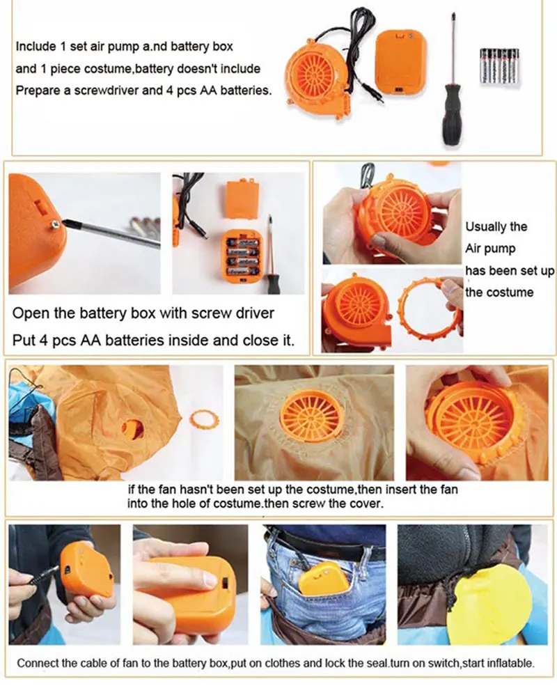 Комплект товара: одежда, вентиляционный вентилятор, батарейный отсек (требуется от 4 батареек праздничного размера 5).
